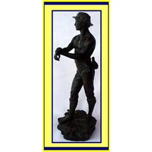 Original statue by famous 19th century French artist, Charles Levy (died 1899). Depicts handsome working man, possibly a miner or a harvester, taking a break. Name of the work is FANEUR. 9 1/2inches high. Stands on naturalistic rock formed base with sheaths of wheat lying behind the young man. There are a number of hand-impressed marks on the base, including the artist's name (twice), and others that I believe are the foundry/maker's marks. PAN EUR PAR CH. LEVY and SALON DES BEAUX ARTS. The barefoot worker is dressed only in a pair of trousers rolled up to the knees and a sash around his waist from which a water bottle and handkerchief hang at the back. Marvellous physique - thin with clearly defined muscles and strongly chiselled face under a small hat. Fabulous fine detail such as the tendons in the neck, crease of the clothes that show the muscular thighs clearly underneath and beautiful fingers and back. Excellent condition.