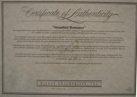Presented here is an animation print of a scene from "Fantasia 2000," inspired by the "Piano Concerto #2." Walt Disney Studios has created this character image using the fine art printing process of color reproduction known as "Giclée." Included in the lower right corner is a Walt Disney Animation Art seal. As shown, a steadfast tin soldier is reunited with a beautiful ballerina. It is easy to see that their faith proves the power of true love!.