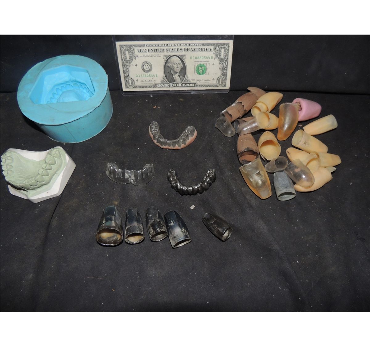These are DR DOOM's screen used hero teeth with a life cast, a set of finger tips, and a lot of unused tips.