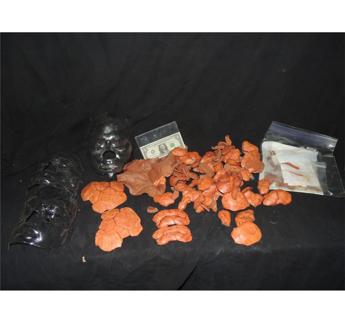 This is a huge lot of Thing head and dace parts cut from Screen Used Hero suits for patches to fix other suits. There are 2 chins and 2 skull caps along with lots of individual panels.