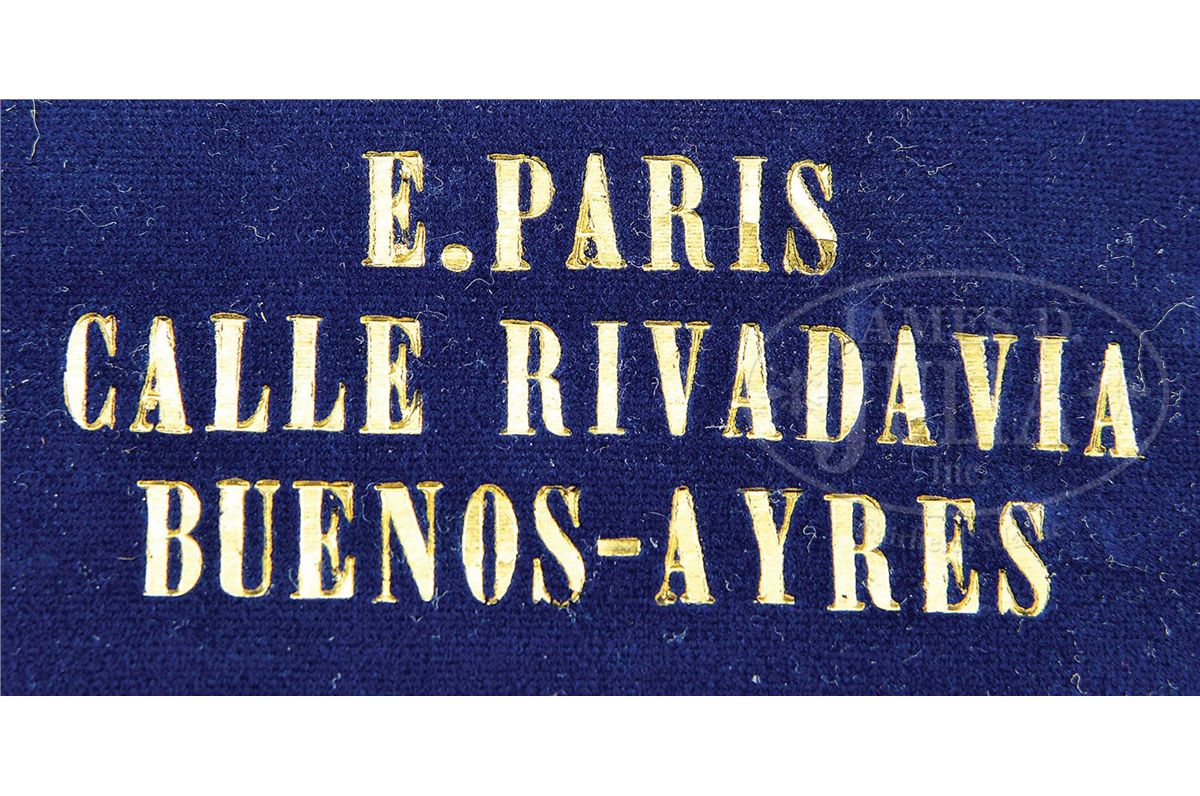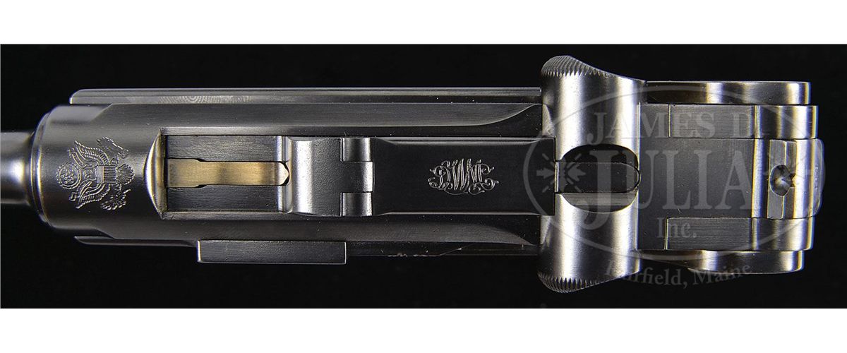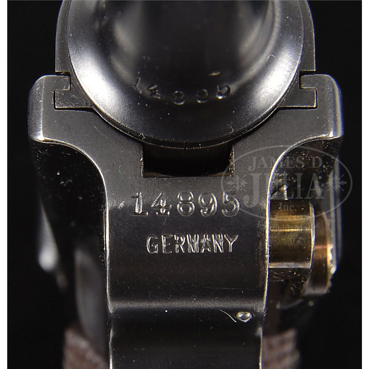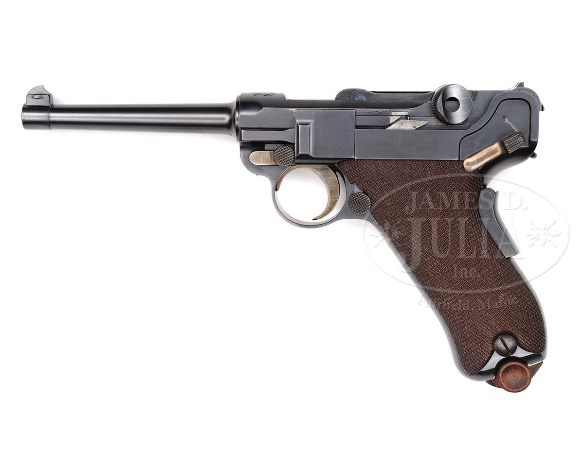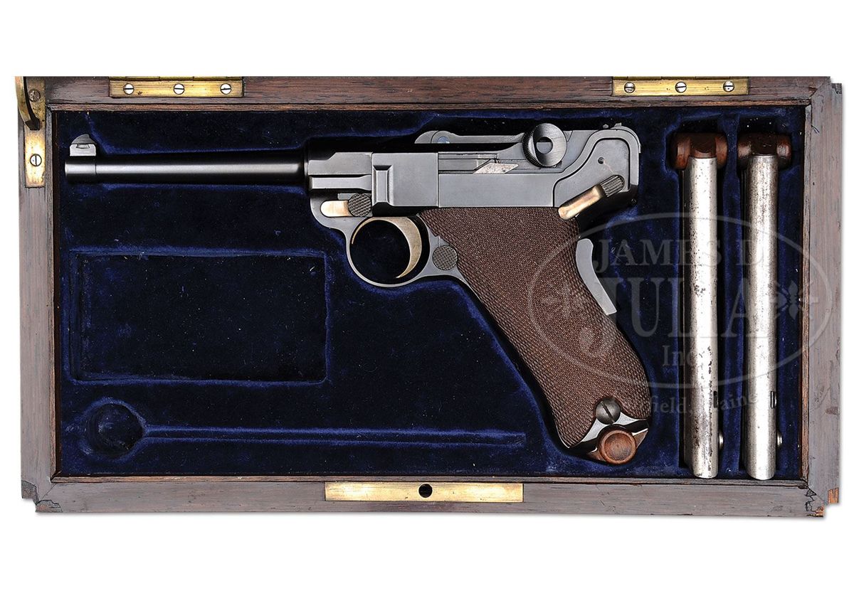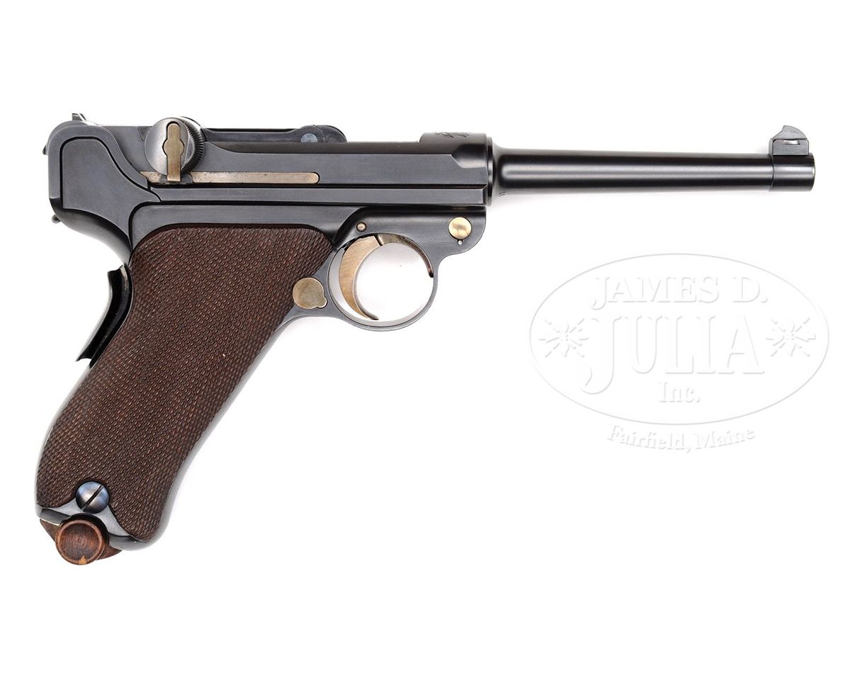SN 14895. 4-3/4" 30 Cal. bbl. American eagle above chamber. "DWM" on center toggle link. Dished toggles. Grip safety. Checkered walnut grips. "GERMANY" marked below serial number on front of frame. Plain wood bottom magazine. This gun is featured on pp. 223, 225, 759, 1136, and 1138 of Dr. Geoffrey Sturgess' The Borchardt & Luger Automatic Pistols. Gun and original two extra magazines are in a blue velvet lined fitted tropical hardwood (typical of South American cases) case with exterior brass fittings and decorations with "E. PARIS/CALLE RIVADAVIA/BUENOS-AYRES" marked in gold letters on blue silk lid lining. This case is featured on p. 1442 of Dr. Geoffrey Sturgess' The Borchardt & Luger Automatic Pistols. PROVENANCE: Collection of Dr. Geoffrey Sturgess. CONDITION: Near perfect restoration to new condition. 99% blue and 99% straw. Bore has light pitting. Checkered walnut grips are lightly worn. Magazine is excellent with one minor chip on the wood bottom. Mechanics are excellent. Could easily pass for original condition. The case is very fine with excellent interior. Some chips on exterior and missing a few wood corner reinforcements. Missing brass key lock. Extra magazines are in excellent condition. 4-52169 BWS90