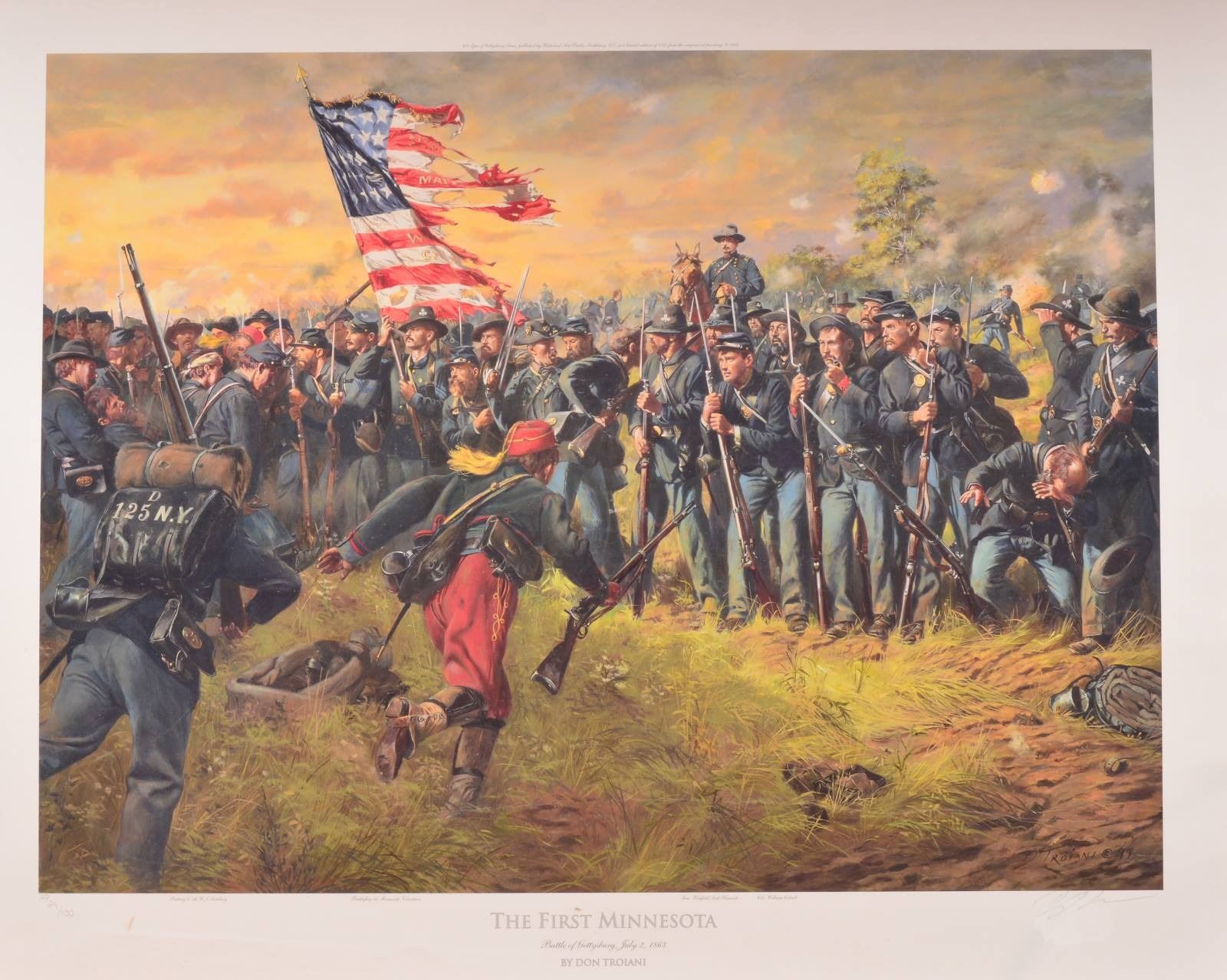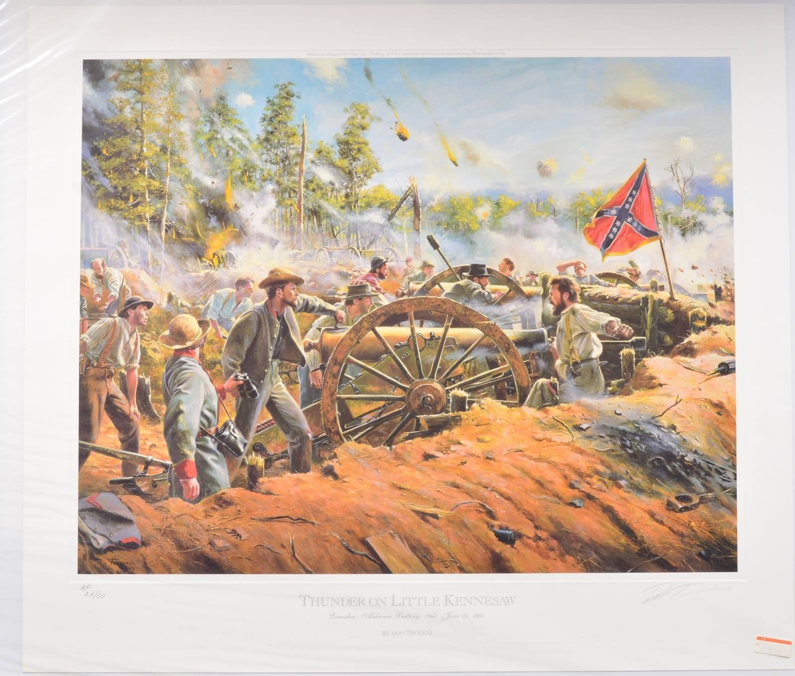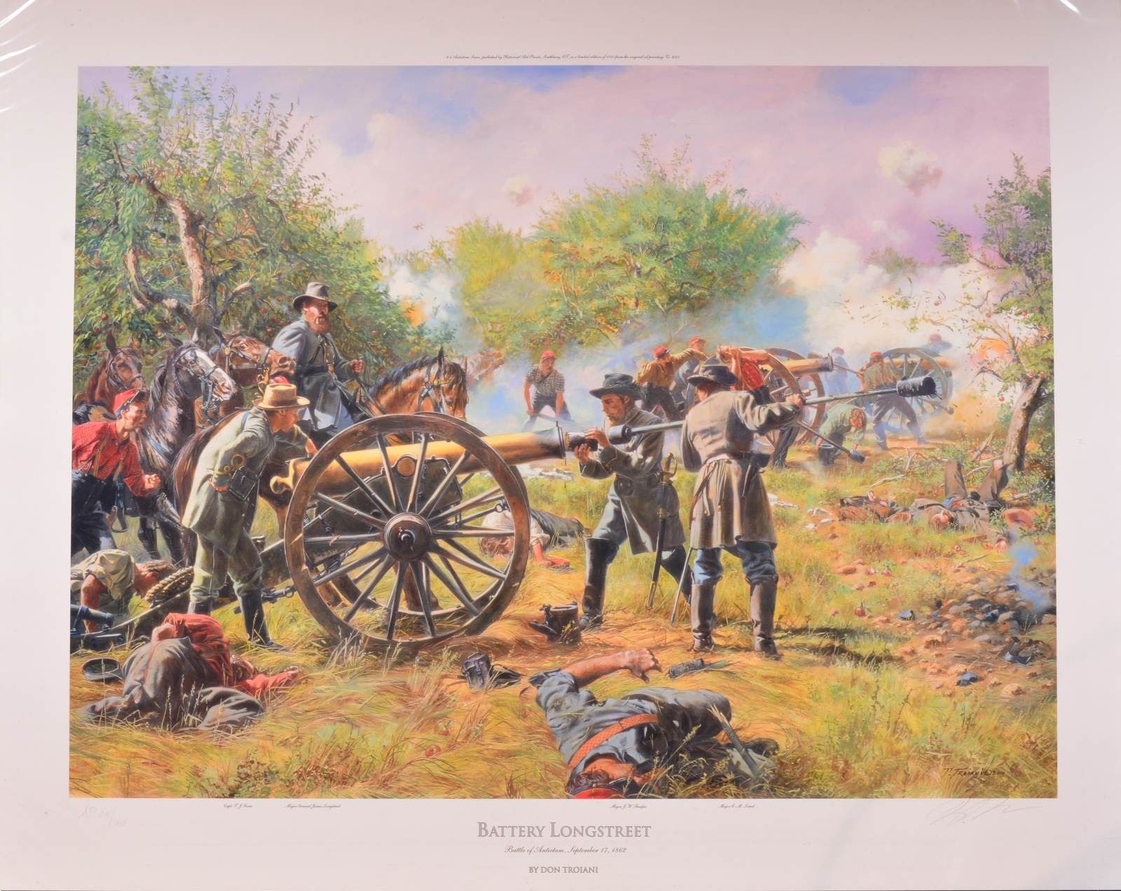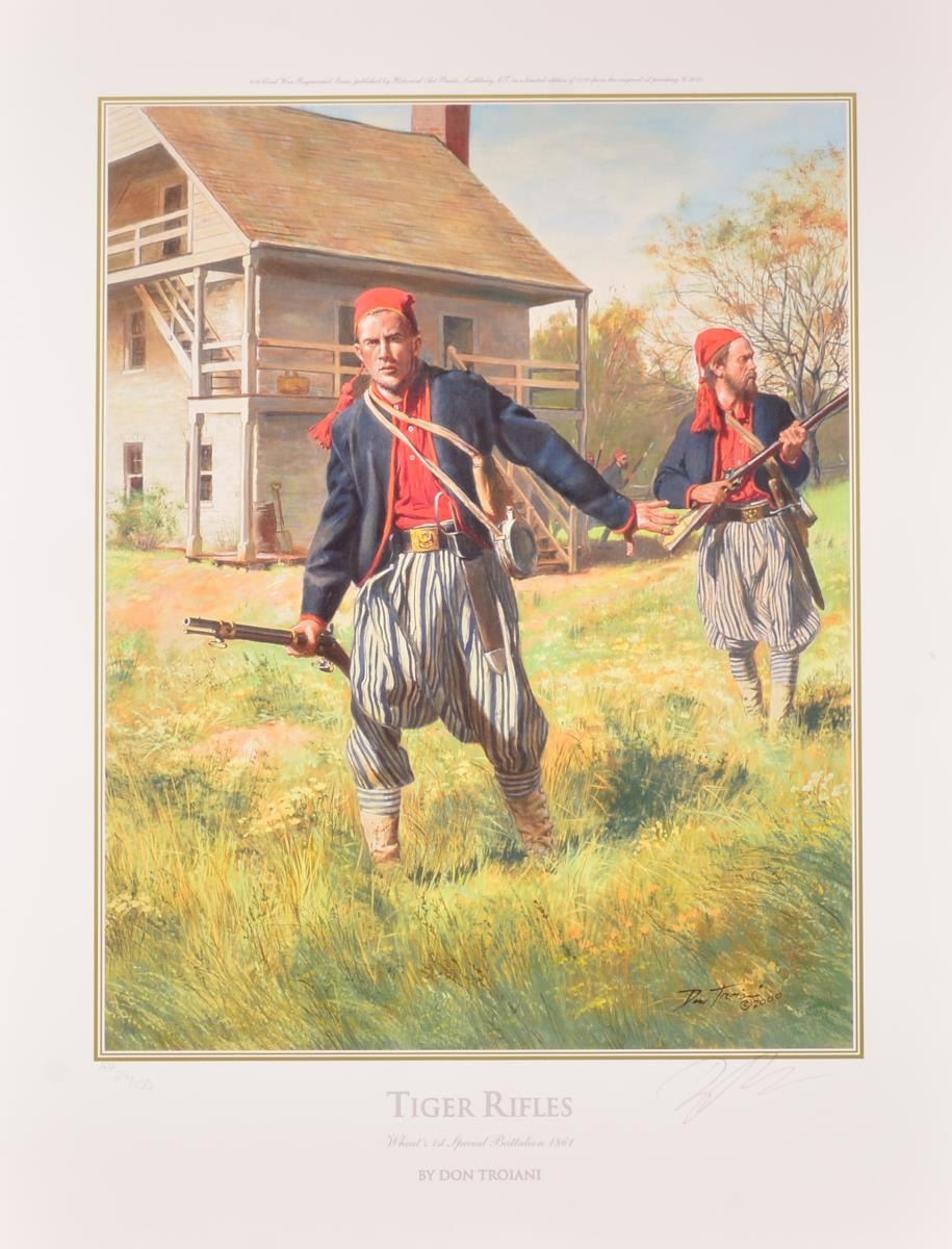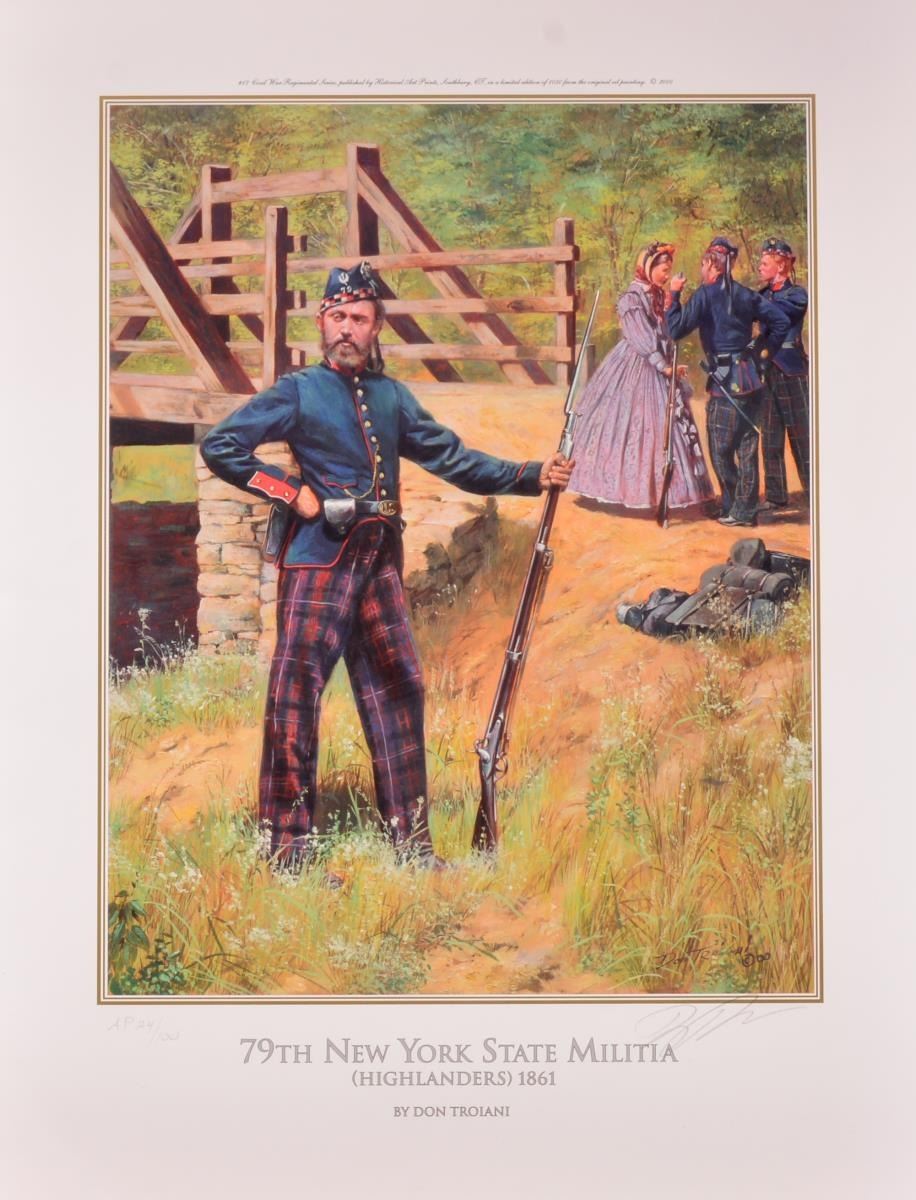HISTORICAL LIMITED EDITION SIGNED PRINTS; ALL NUMBERED THE SAME. 60 Limited-edition Historical Arts by Don Troiani. None of these have ever been framed, and are in perfect condition, flat mounted in archival plastic sleeves, most accompanied by matching numbered certificates of authenticity. Never has such a large quantity ever been offered in auction, each numbered “AP 24” and signed by the artist. 1) Barksdale’s Charge 2) The Bonnie Blue Flag 3) The Boy Colonel 4) Charge 5) The Diehards 6) Eagle of the 8th 7) Fire on Caroline Street 8) The First Minnesota 9) General Nathan Bedford Forrest 10) General Patrick Cleburne 11) Men of Arkansas 12) Opydcke’s Tigers 13) Ranger Mosby 14) The Red Devils 15) 1st South Carolina Rifles 1861 16) 69th New York State Militia Company K (Irish Zouaves) 1861 17) Tiger Rifles 18) Washington Artillery 19) Band of Brothers 20) Brandy Station Review 21) Confederate States Marine Corps 22) Confederate States Medical Service 23) Emblems of Valor 24) The Emmitsburg Road 25) For God’s Sake Forward 26) The Forlorn Hope 27) Hampton’s Duel 28) Jackson Is with You 29) McPherson’s Ridge 30) 155th Pennsylvania Regiment 1864 31) Retreat by Recoil 32) 2nd US Cavalry 1861 33) Thunder on Little Kennesaw 34) 12th Virginia Cavalry 35) United States Marines 36) Until Sundown 37) Battery Longstreet 38) Brothers of Ireland 39) Bunker Hill 40) Burnsides Bridge 41) Brushy Run 42) Cemetery Hill 43) Colonel of the Confederacy 44) Decision at Dawn 45) Don’t Give an Inch 46) Drive Them to Washington 47) Eve of the Storm 48) The 1st Battle Flags 49) First at Manassas 50) 1st North Carolina Cavalry 1861 51) 1st South Carolina Volunteer Infantry 52) The Gray Comanches 53) The High Watermark 54) Iron Brigade (24th Michigan) at Gettysburg 55) Lions of the Round Top 56) Toward the Angle 57) Rock of Erin 58) Lone Star 59) 79th New York State Militia (Highlanders) 60) New York's Bravest CONDITION: fine overall, no condition issues noted. Sizes vary from regimental about 15x20" to 27x36", most are about 24". (02-13992-1/JS). $6,500-7,500.