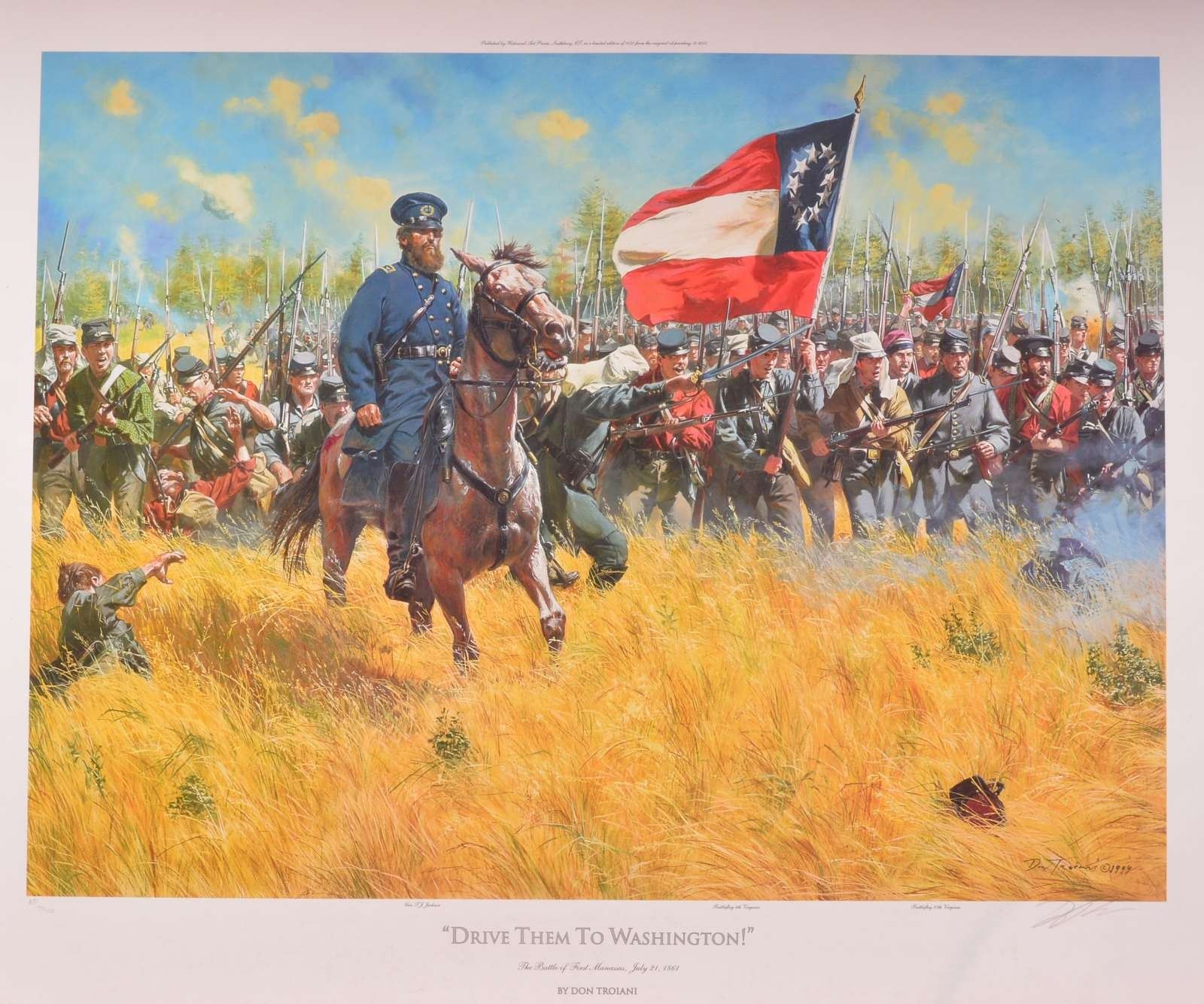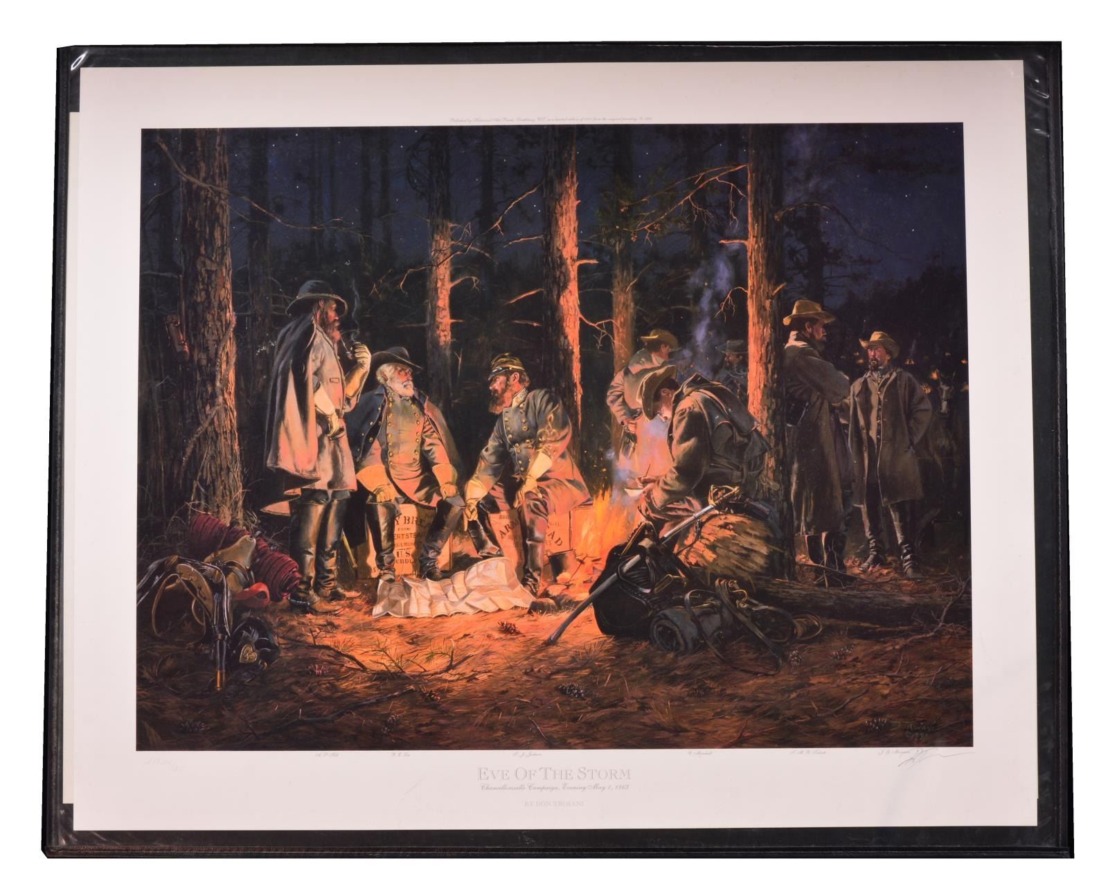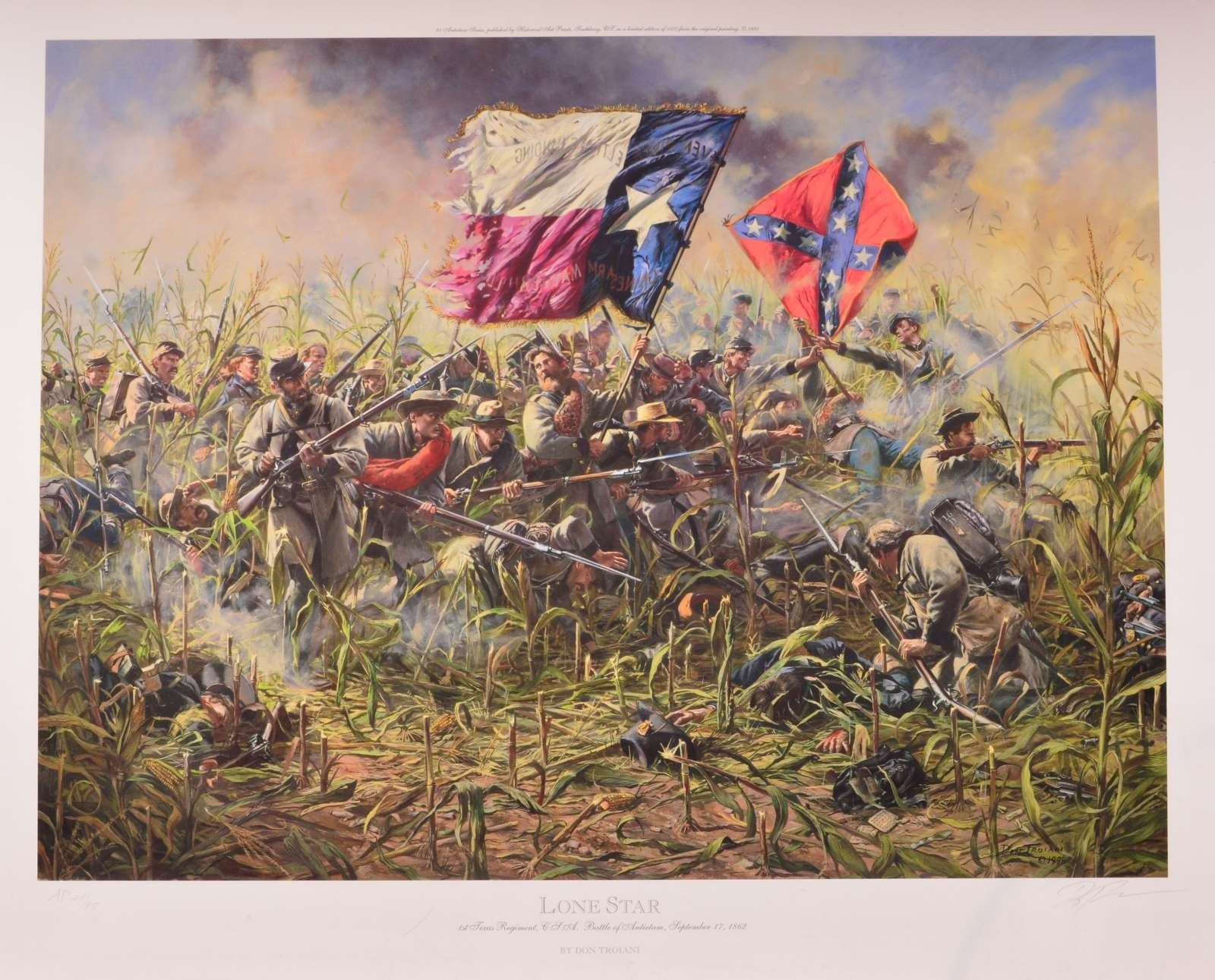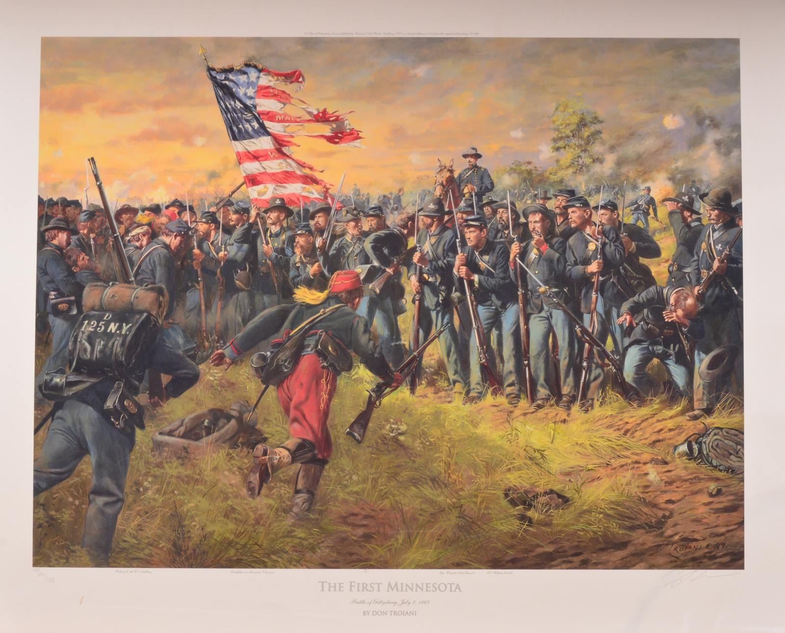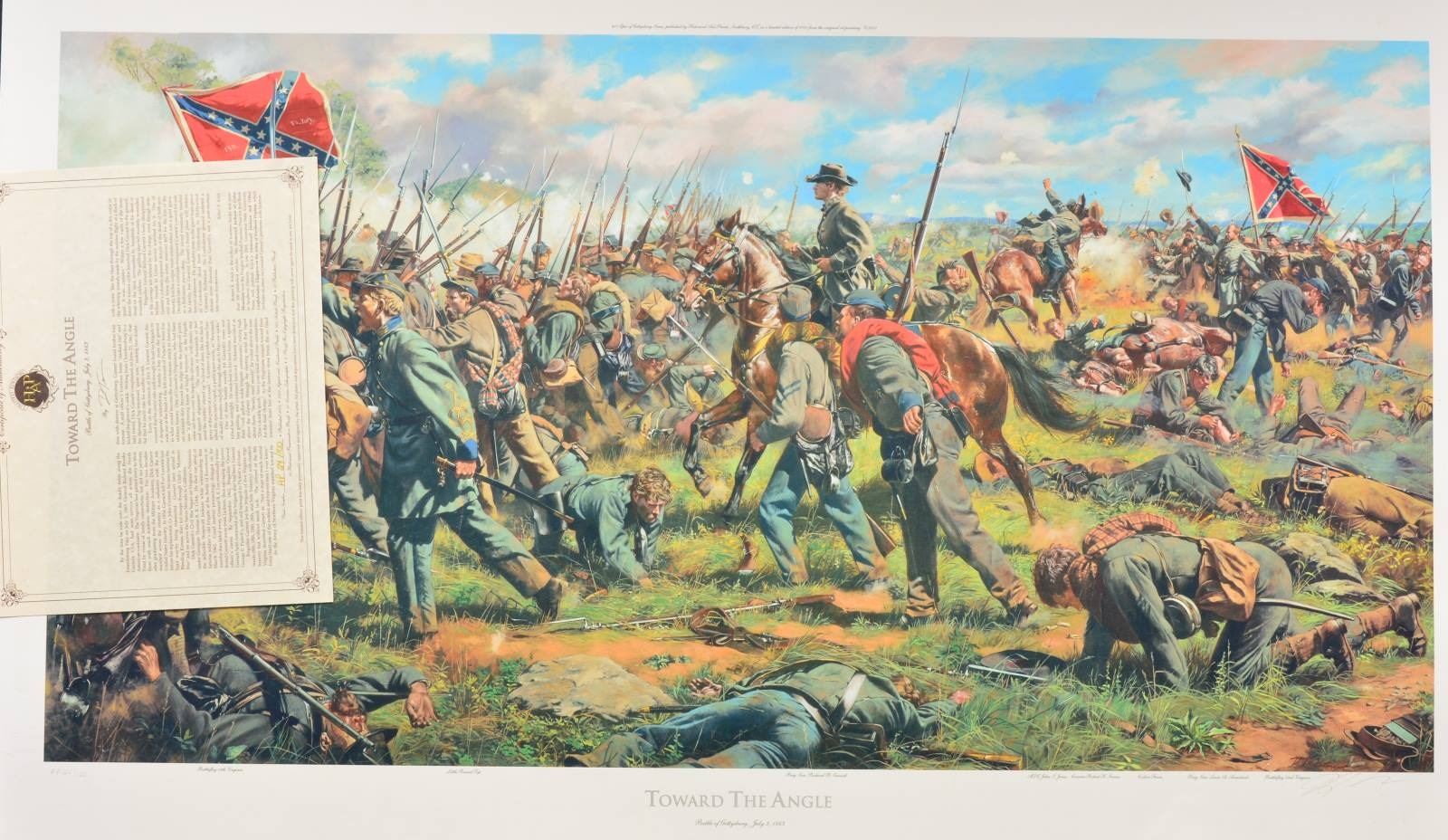 HISTORICAL LIMITED EDITION SIGNED PRINTS; ALL NUMBERED THE SAME. 60 Limited-edition Historical Arts by Don Troiani. None of these have ever been framed, and are in perfect condition, flat mounted in archival plastic sleeves, most accompanied by matching numbered certificates of authenticity. Never has such a large quantity ever been offered in auction, each numbered “AP 24” and signed by the artist. 1) Barksdale’s Charge 2) The Bonnie Blue Flag 3) The Boy Colonel 4) Charge 5) The Diehards 6) Eagle of the 8th 7) Fire on Caroline Street 8) The First Minnesota 9) General Nathan Bedford Forrest 10) General Patrick Cleburne 11) Men of Arkansas 12) Opydcke’s Tigers 13) Ranger Mosby 14) The Red Devils 15) 1st South Carolina Rifles 1861 16) 69th New York State Militia Company K (Irish Zouaves) 1861 17) Tiger Rifles 18) Washington Artillery 19) Band of Brothers 20) Brandy Station Review 21) Confederate States Marine Corps 22) Confederate States Medical Service 23) Emblems of Valor 24) The Emmitsburg Road 25) For God’s Sake Forward 26) The Forlorn Hope 27) Hampton’s Duel 28) Jackson Is with You 29) McPherson’s Ridge 30) 155th Pennsylvania Regiment 1864 31) Retreat by Recoil 32) 2nd US Cavalry 1861 33) Thunder on Little Kennesaw 34) 12th Virginia Cavalry 35) United States Marines 36) Until Sundown 37) Battery Longstreet 38) Brothers of Ireland 39) Bunker Hill 40) Burnsides Bridge 41) Brushy Run 42) Cemetery Hill 43) Colonel of the Confederacy 44) Decision at Dawn 45) Don’t Give an Inch 46) Drive Them to Washington 47) Eve of the Storm 48) The 1st Battle Flags 49) First at Manassas 50) 1st North Carolina Cavalry 1861 51) 1st South Carolina Volunteer Infantry 52) The Gray Comanches 53) The High Watermark 54) Iron Brigade (24th Michigan) at Gettysburg 55) Lions of the Round Top 56) Toward the Angle 57) Rock of Erin 58) Lone Star 59) 79th New York State Militia (Highlanders) 60) New York's Bravest CONDITION: fine overall, no condition issues noted. Sizes vary from regimental about 15x20" to 27x36", most are about 24". (02-13992-1/JS). $6,500-7,500.