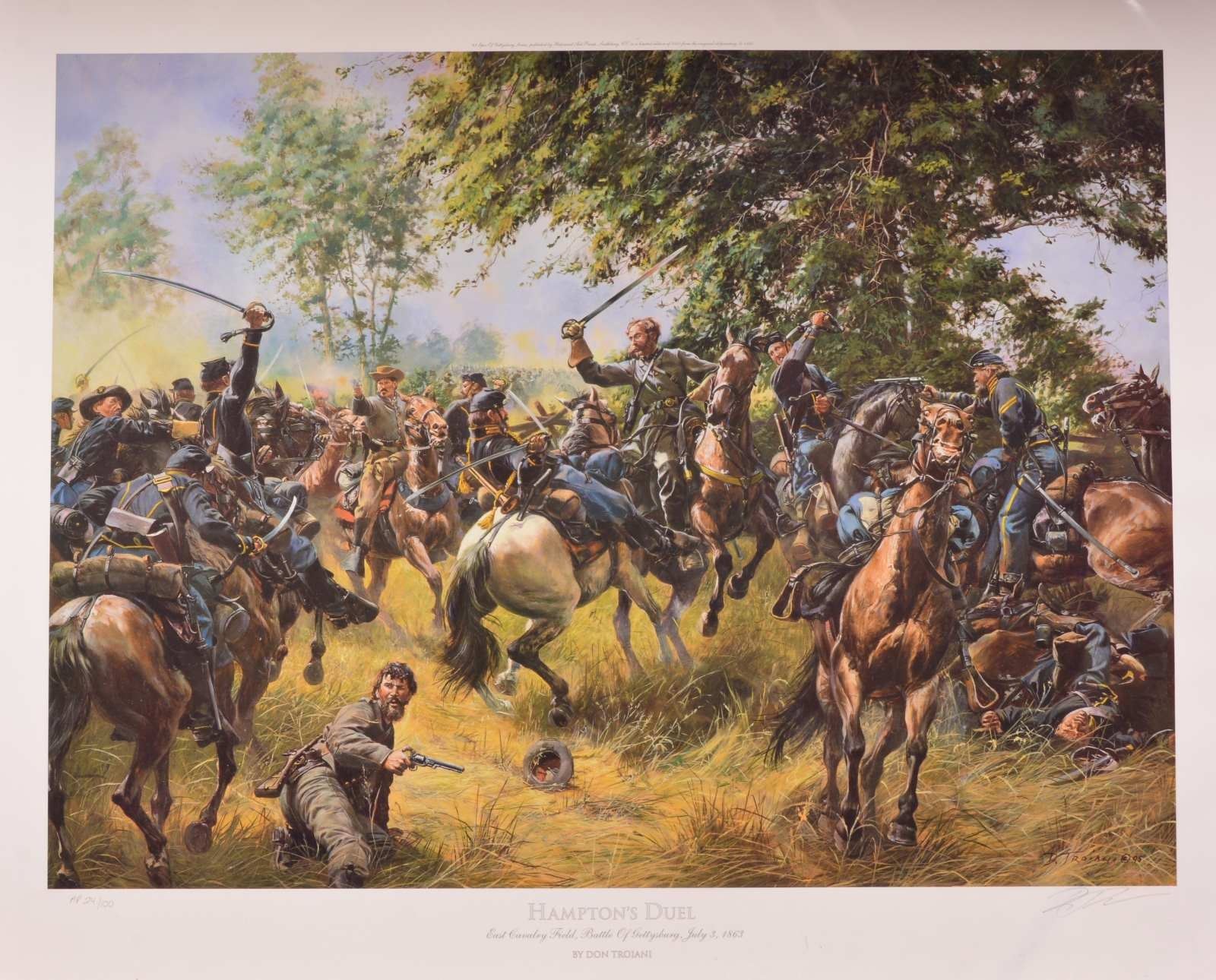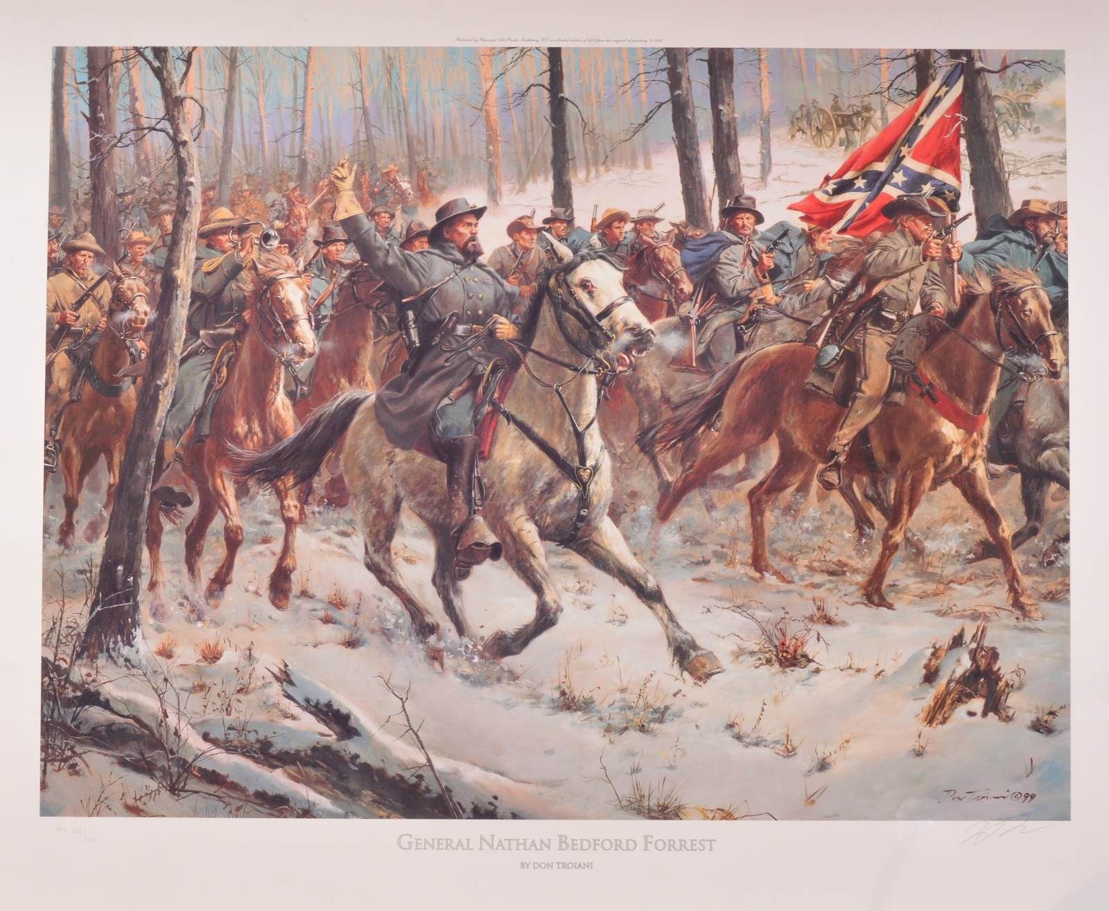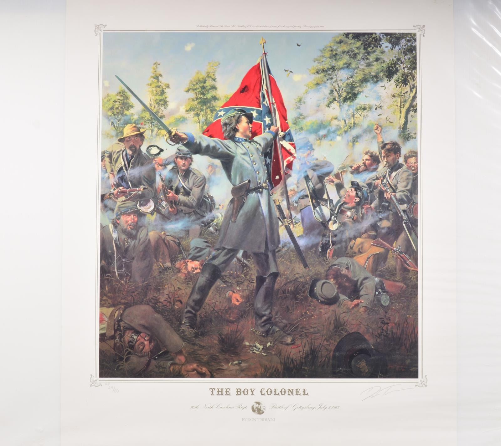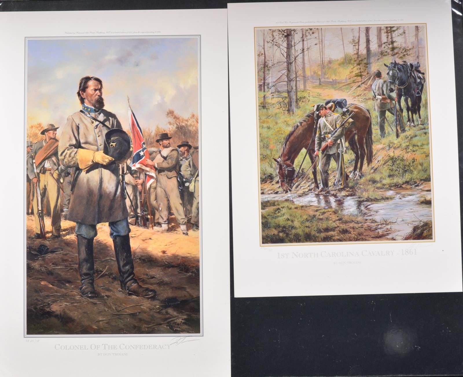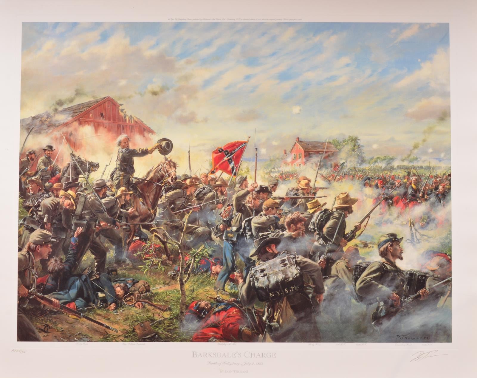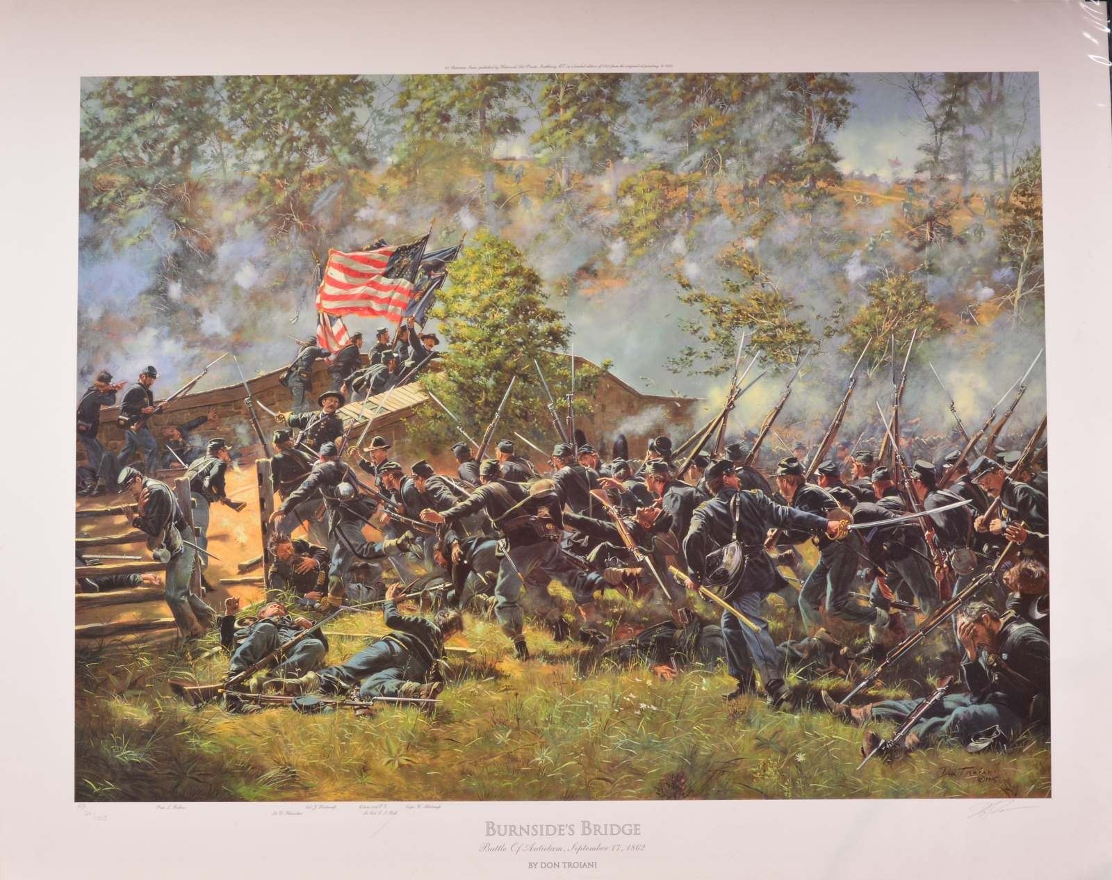 HISTORICAL LIMITED EDITION SIGNED PRINTS; ALL NUMBERED THE SAME. 60 Limited-edition Historical Arts by Don Troiani. None of these have ever been framed, and are in perfect condition, flat mounted in archival plastic sleeves, most accompanied by matching numbered certificates of authenticity. Never has such a large quantity ever been offered in auction, each numbered “AP 24” and signed by the artist. 1) Barksdale’s Charge 2) The Bonnie Blue Flag 3) The Boy Colonel 4) Charge 5) The Diehards 6) Eagle of the 8th 7) Fire on Caroline Street 8) The First Minnesota 9) General Nathan Bedford Forrest 10) General Patrick Cleburne 11) Men of Arkansas 12) Opydcke’s Tigers 13) Ranger Mosby 14) The Red Devils 15) 1st South Carolina Rifles 1861 16) 69th New York State Militia Company K (Irish Zouaves) 1861 17) Tiger Rifles 18) Washington Artillery 19) Band of Brothers 20) Brandy Station Review 21) Confederate States Marine Corps 22) Confederate States Medical Service 23) Emblems of Valor 24) The Emmitsburg Road 25) For God’s Sake Forward 26) The Forlorn Hope 27) Hampton’s Duel 28) Jackson Is with You 29) McPherson’s Ridge 30) 155th Pennsylvania Regiment 1864 31) Retreat by Recoil 32) 2nd US Cavalry 1861 33) Thunder on Little Kennesaw 34) 12th Virginia Cavalry 35) United States Marines 36) Until Sundown 37) Battery Longstreet 38) Brothers of Ireland 39) Bunker Hill 40) Burnsides Bridge 41) Brushy Run 42) Cemetery Hill 43) Colonel of the Confederacy 44) Decision at Dawn 45) Don’t Give an Inch 46) Drive Them to Washington 47) Eve of the Storm 48) The 1st Battle Flags 49) First at Manassas 50) 1st North Carolina Cavalry 1861 51) 1st South Carolina Volunteer Infantry 52) The Gray Comanches 53) The High Watermark 54) Iron Brigade (24th Michigan) at Gettysburg 55) Lions of the Round Top 56) Toward the Angle 57) Rock of Erin 58) Lone Star 59) 79th New York State Militia (Highlanders) 60) New York's Bravest CONDITION: fine overall, no condition issues noted. Sizes vary from regimental about 15x20" to 27x36", most are about 24". (02-13992-1/JS). $6,500-7,500.