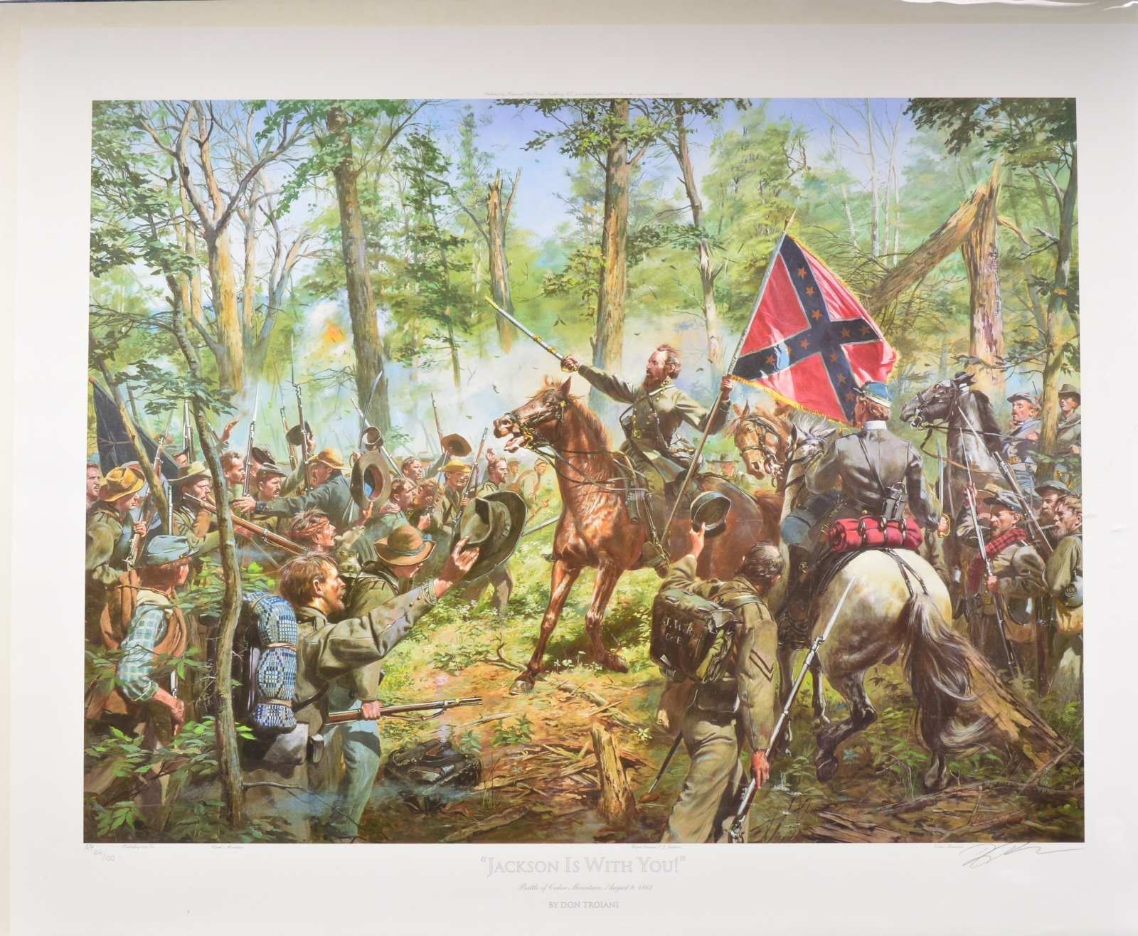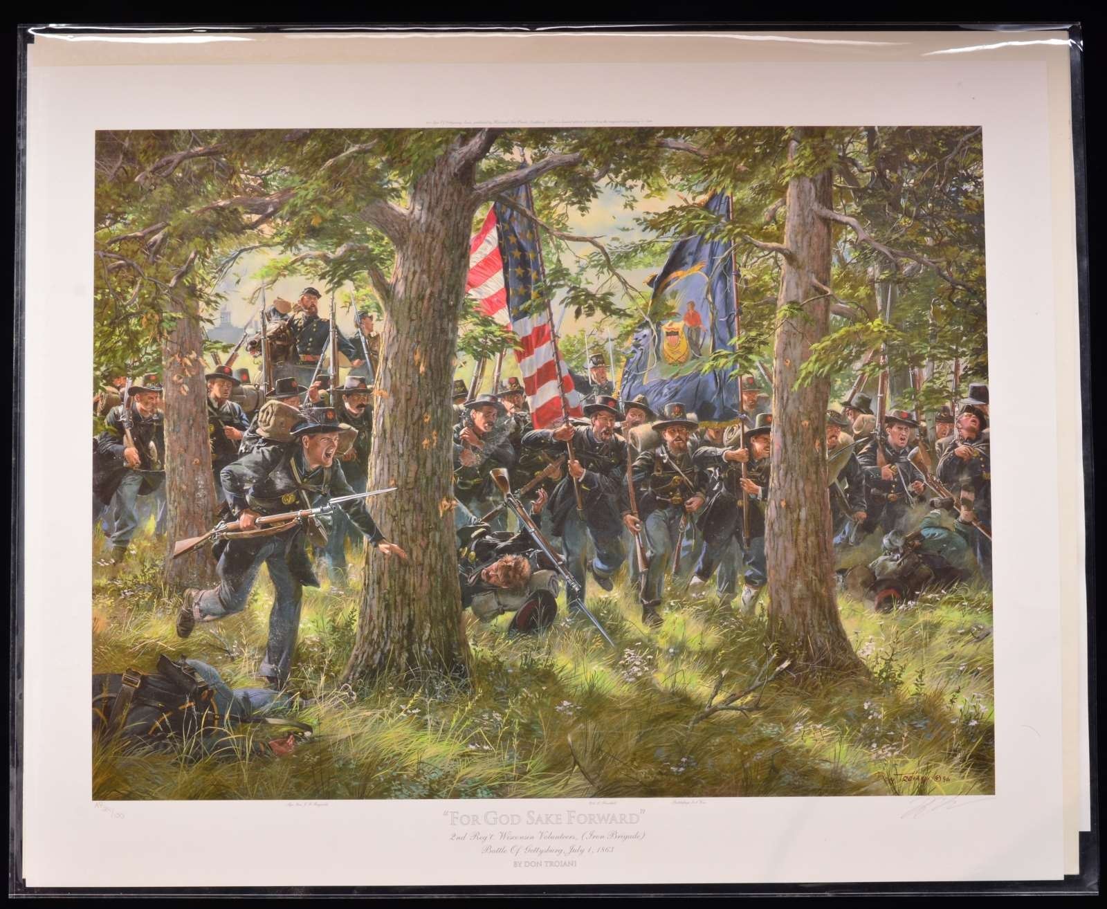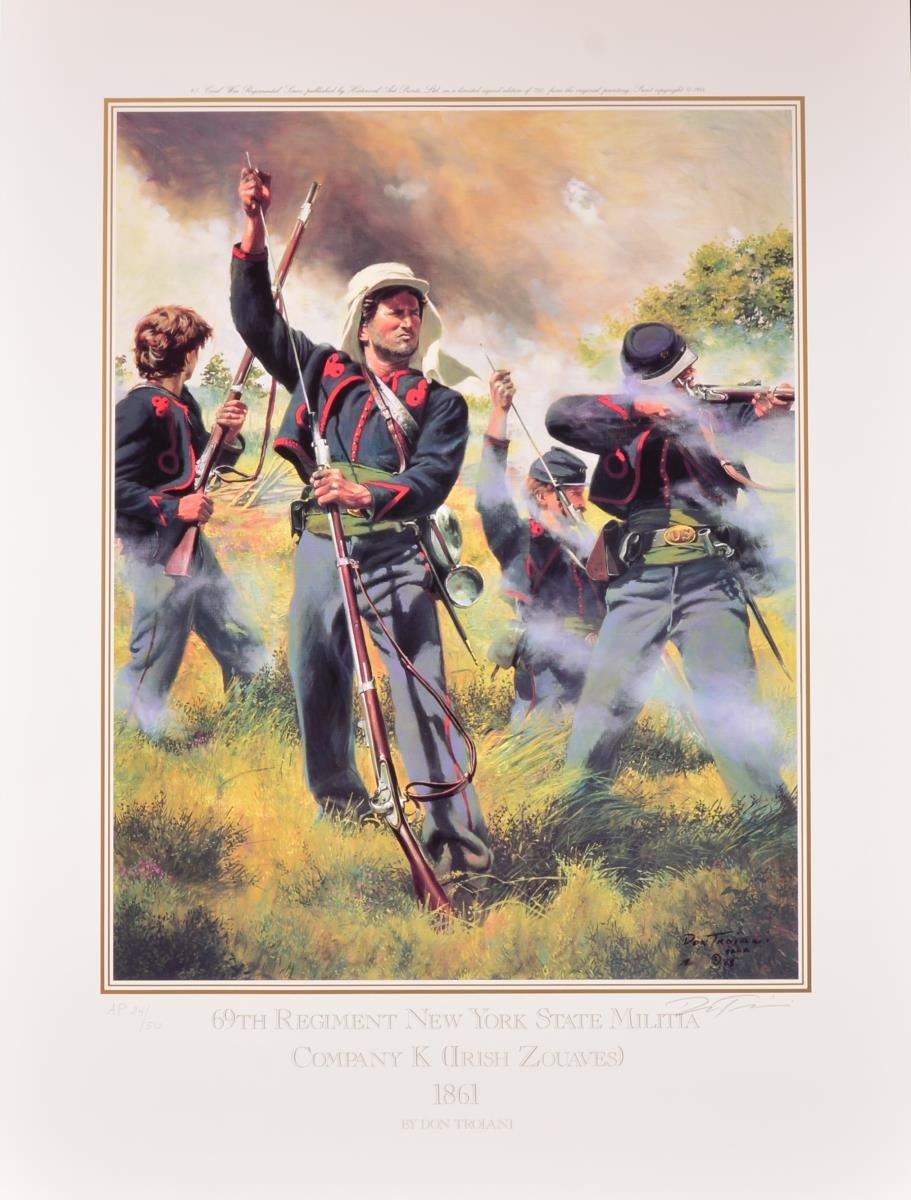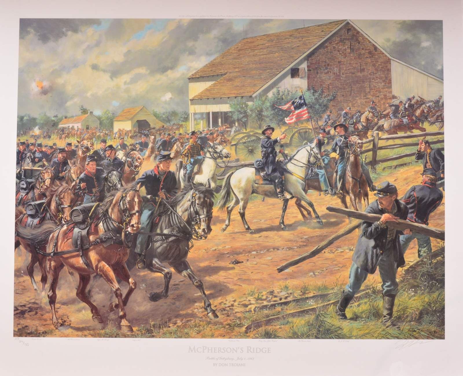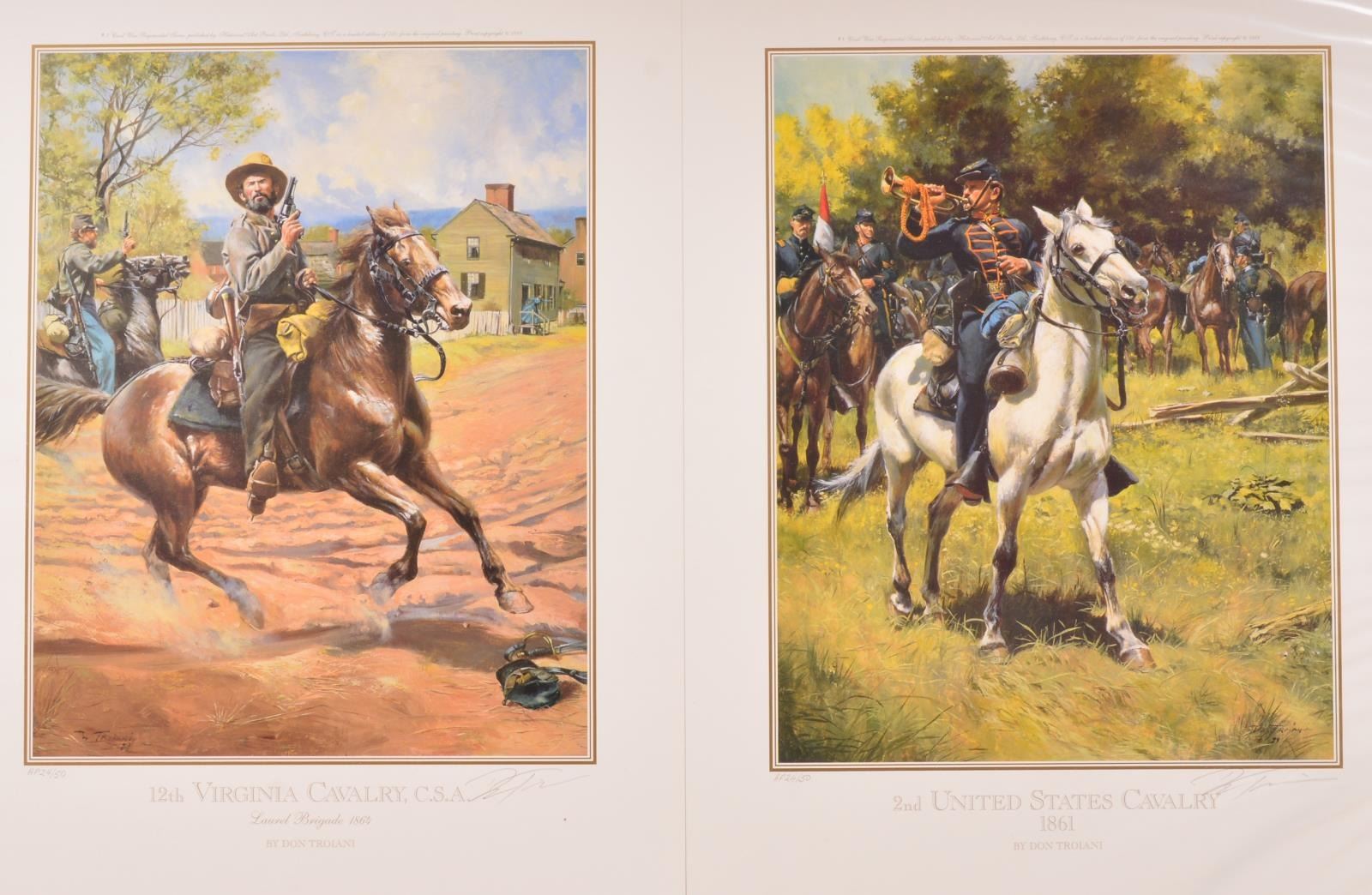 HISTORICAL LIMITED EDITION SIGNED PRINTS; ALL NUMBERED THE SAME. 60 Limited-edition Historical Arts by Don Troiani. None of these have ever been framed, and are in perfect condition, flat mounted in archival plastic sleeves, most accompanied by matching numbered certificates of authenticity. Never has such a large quantity ever been offered in auction, each numbered “AP 24” and signed by the artist. 1) Barksdale’s Charge 2) The Bonnie Blue Flag 3) The Boy Colonel 4) Charge 5) The Diehards 6) Eagle of the 8th 7) Fire on Caroline Street 8) The First Minnesota 9) General Nathan Bedford Forrest 10) General Patrick Cleburne 11) Men of Arkansas 12) Opydcke’s Tigers 13) Ranger Mosby 14) The Red Devils 15) 1st South Carolina Rifles 1861 16) 69th New York State Militia Company K (Irish Zouaves) 1861 17) Tiger Rifles 18) Washington Artillery 19) Band of Brothers 20) Brandy Station Review 21) Confederate States Marine Corps 22) Confederate States Medical Service 23) Emblems of Valor 24) The Emmitsburg Road 25) For God’s Sake Forward 26) The Forlorn Hope 27) Hampton’s Duel 28) Jackson Is with You 29) McPherson’s Ridge 30) 155th Pennsylvania Regiment 1864 31) Retreat by Recoil 32) 2nd US Cavalry 1861 33) Thunder on Little Kennesaw 34) 12th Virginia Cavalry 35) United States Marines 36) Until Sundown 37) Battery Longstreet 38) Brothers of Ireland 39) Bunker Hill 40) Burnsides Bridge 41) Brushy Run 42) Cemetery Hill 43) Colonel of the Confederacy 44) Decision at Dawn 45) Don’t Give an Inch 46) Drive Them to Washington 47) Eve of the Storm 48) The 1st Battle Flags 49) First at Manassas 50) 1st North Carolina Cavalry 1861 51) 1st South Carolina Volunteer Infantry 52) The Gray Comanches 53) The High Watermark 54) Iron Brigade (24th Michigan) at Gettysburg 55) Lions of the Round Top 56) Toward the Angle 57) Rock of Erin 58) Lone Star 59) 79th New York State Militia (Highlanders) 60) New York's Bravest CONDITION: fine overall, no condition issues noted. Sizes vary from regimental about 15x20" to 27x36", most are about 24". (02-13992-1/JS). $6,500-7,500.