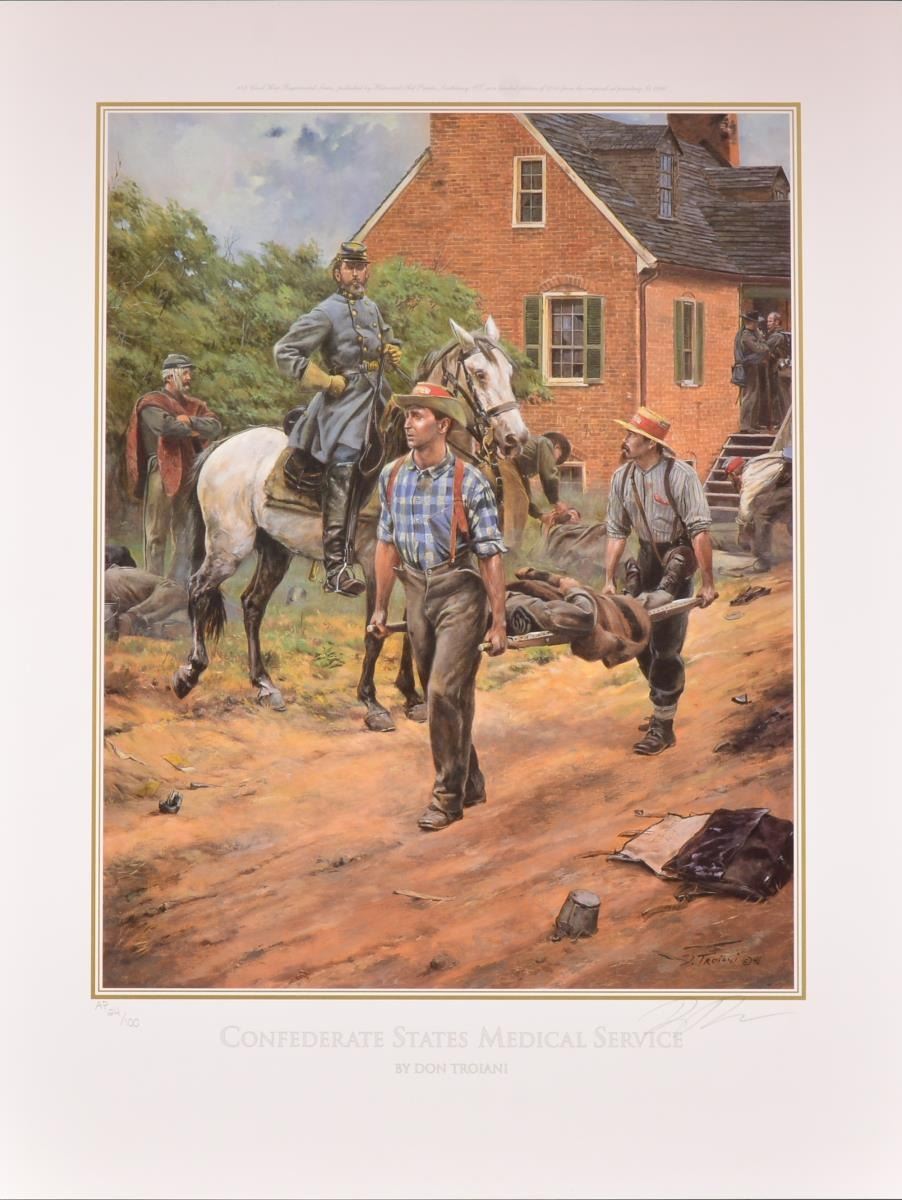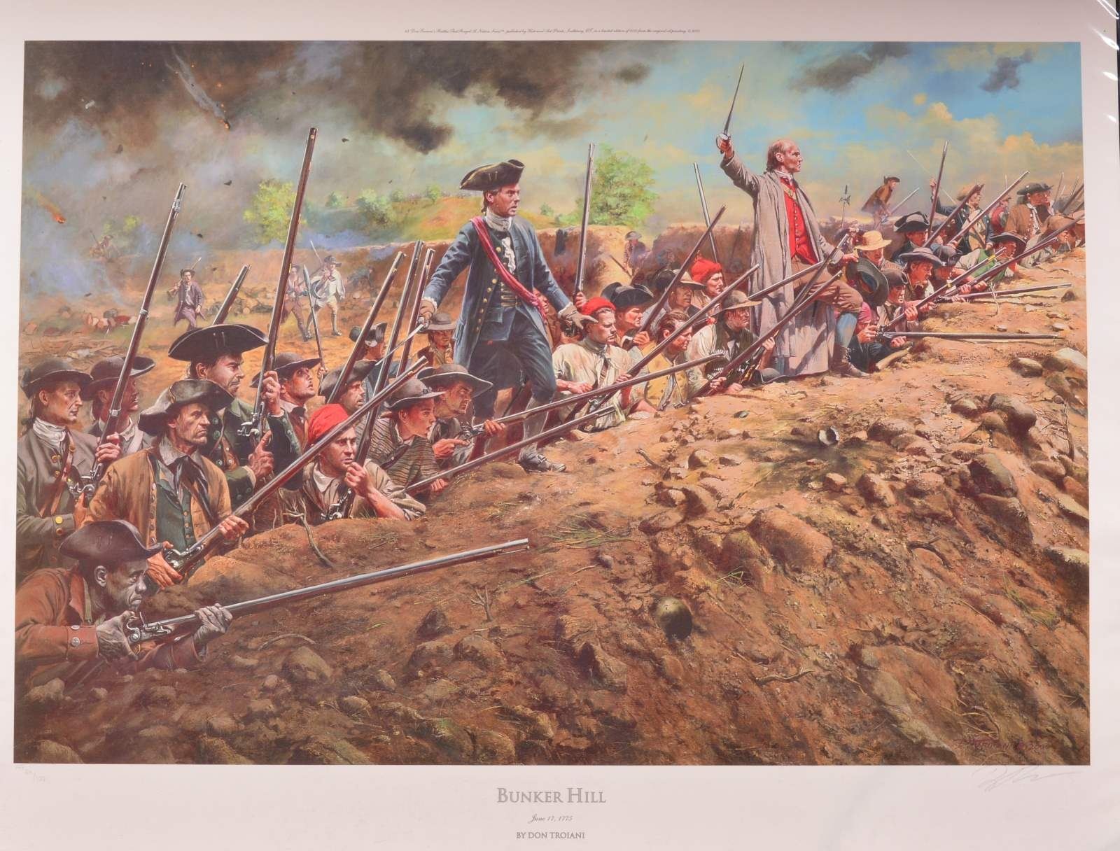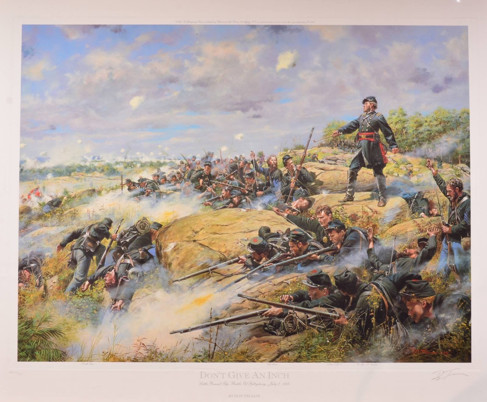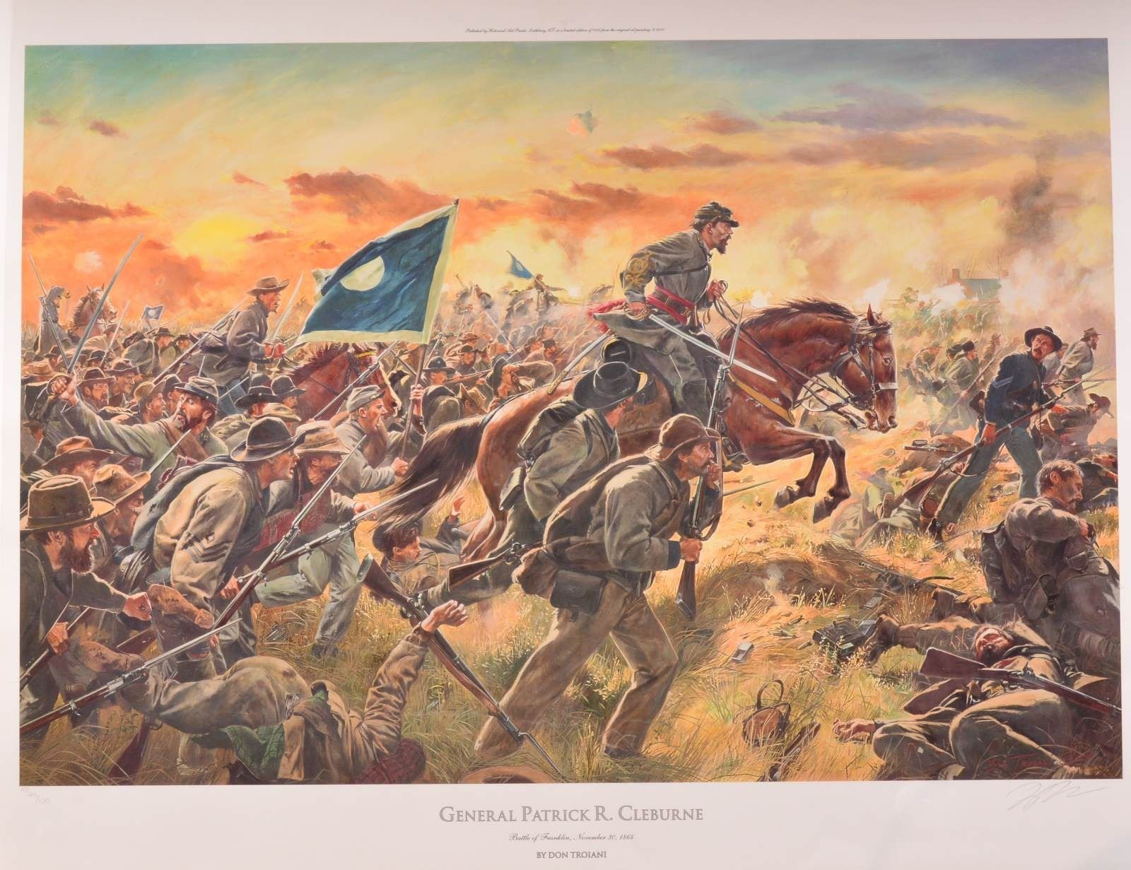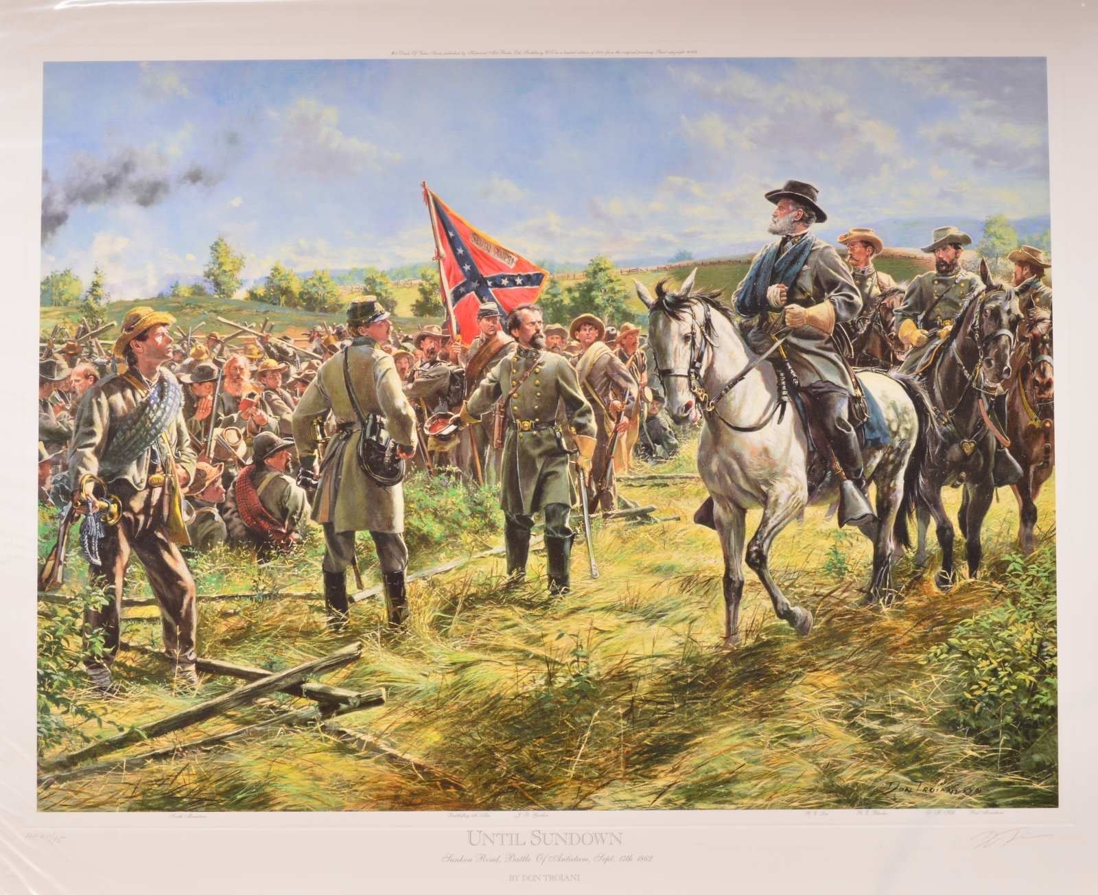 HISTORICAL LIMITED EDITION SIGNED PRINTS; ALL NUMBERED THE SAME. 60 Limited-edition Historical Arts by Don Troiani. None of these have ever been framed, and are in perfect condition, flat mounted in archival plastic sleeves, most accompanied by matching numbered certificates of authenticity. Never has such a large quantity ever been offered in auction, each numbered “AP 24” and signed by the artist. 1) Barksdale’s Charge 2) The Bonnie Blue Flag 3) The Boy Colonel 4) Charge 5) The Diehards 6) Eagle of the 8th 7) Fire on Caroline Street 8) The First Minnesota 9) General Nathan Bedford Forrest 10) General Patrick Cleburne 11) Men of Arkansas 12) Opydcke’s Tigers 13) Ranger Mosby 14) The Red Devils 15) 1st South Carolina Rifles 1861 16) 69th New York State Militia Company K (Irish Zouaves) 1861 17) Tiger Rifles 18) Washington Artillery 19) Band of Brothers 20) Brandy Station Review 21) Confederate States Marine Corps 22) Confederate States Medical Service 23) Emblems of Valor 24) The Emmitsburg Road 25) For God’s Sake Forward 26) The Forlorn Hope 27) Hampton’s Duel 28) Jackson Is with You 29) McPherson’s Ridge 30) 155th Pennsylvania Regiment 1864 31) Retreat by Recoil 32) 2nd US Cavalry 1861 33) Thunder on Little Kennesaw 34) 12th Virginia Cavalry 35) United States Marines 36) Until Sundown 37) Battery Longstreet 38) Brothers of Ireland 39) Bunker Hill 40) Burnsides Bridge 41) Brushy Run 42) Cemetery Hill 43) Colonel of the Confederacy 44) Decision at Dawn 45) Don’t Give an Inch 46) Drive Them to Washington 47) Eve of the Storm 48) The 1st Battle Flags 49) First at Manassas 50) 1st North Carolina Cavalry 1861 51) 1st South Carolina Volunteer Infantry 52) The Gray Comanches 53) The High Watermark 54) Iron Brigade (24th Michigan) at Gettysburg 55) Lions of the Round Top 56) Toward the Angle 57) Rock of Erin 58) Lone Star 59) 79th New York State Militia (Highlanders) 60) New York's Bravest CONDITION: fine overall, no condition issues noted. Sizes vary from regimental about 15x20" to 27x36", most are about 24". (02-13992-1/JS). $6,500-7,500.