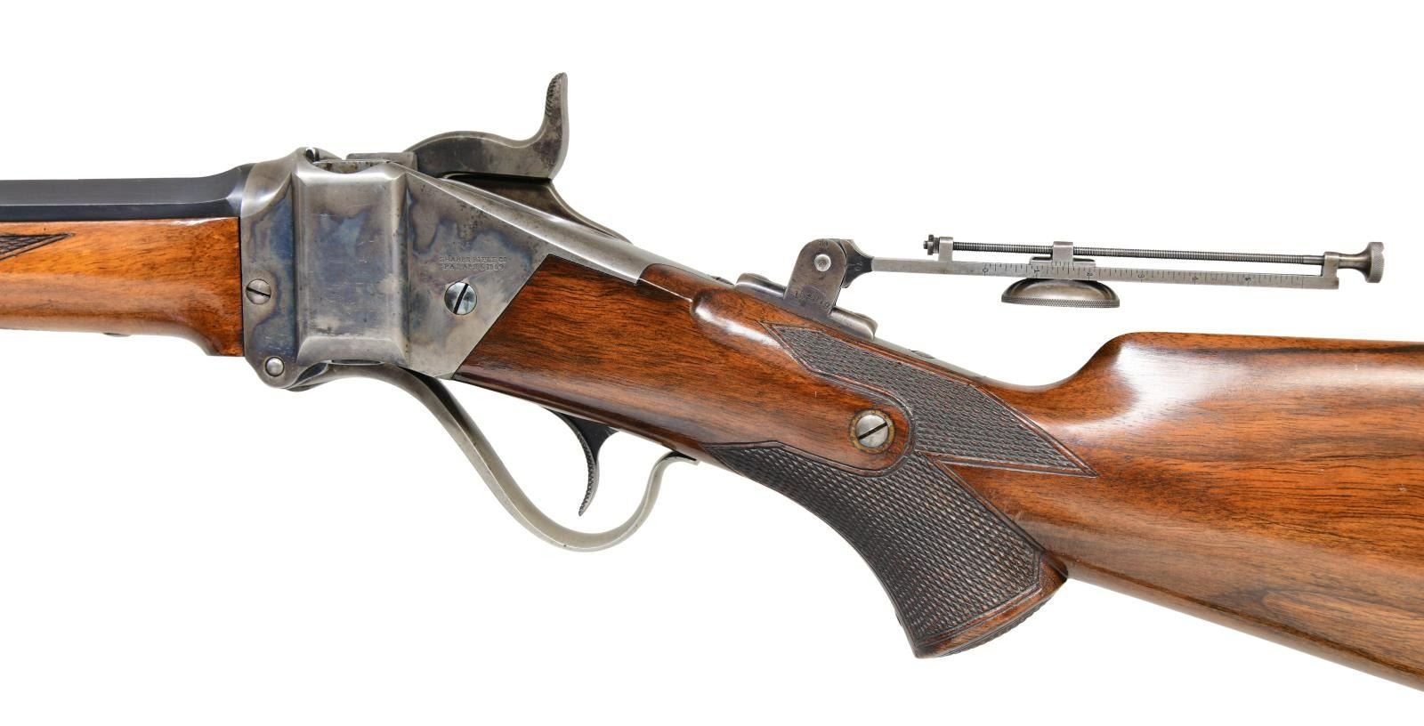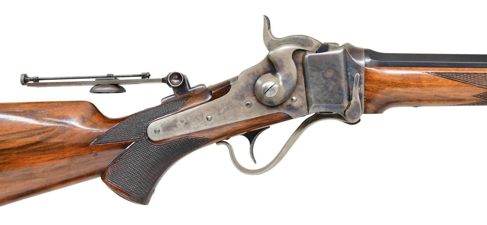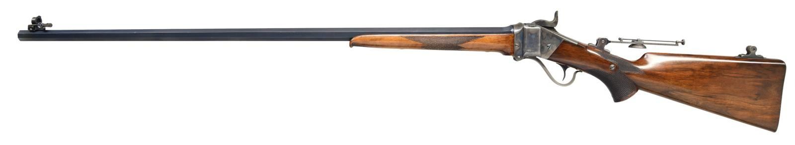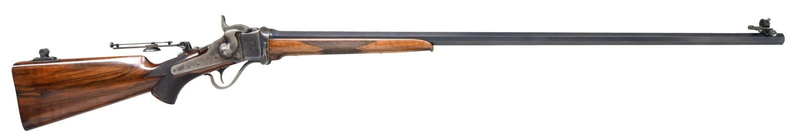 CREEDMOOR SINGLE SHOT RIFLE. Cal. 44-90 Bottleneck. S# 154979. Bbl. 34" tapered oct. measuring 13/16" across flats at muzzle. Wind gauge globe front sight w/ matching numbered long range Vernier tang sight. Case colored action. Checkered plain trigger. Schnable tipped walnut forearm w/ wraparound hand checkering having additional wedge of checkering at tip. Pistol grip walnut stock w/ checkered steel buttplate having second tang sight base mounted at rear of comb. Wrist of stock & bottom of grip are checkered. UNATTACHED ACCESSORIES: includes several letters of correspondence including those w/ RL Moore & Dr. Richard J. Lebowskie between 1974 & 2003 that confirm the features of this rifle. Also included are documentations of past auction sales. CONDITION: bbl. retains over 95% blue showing faint edge wear & small marks. Action has 70% lightly faded case colors. Wood has good finish showing scattered handling light marks. Bore is bright w/ strong rifling. (01-25368/DS). ANTIQUE. $35000-50000.