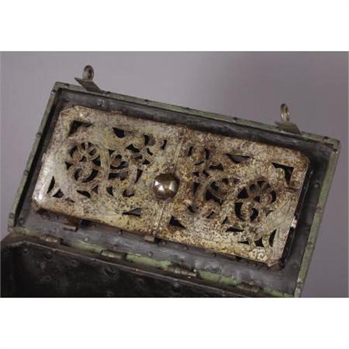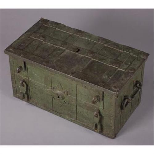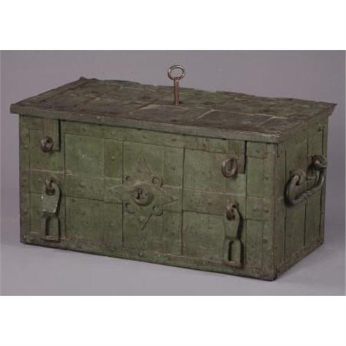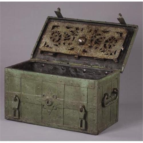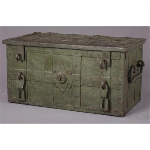 <B>FANTASTIC PIRATE'S TREASURE CHEST (SAFE) SPANISH COLONIAL AMERICA CIRCA 1700-1750</B></I> - All original chest with very fancy locking mechanism with original key. This treasure chest is Spanish colonial era used by very wealthy Spaniards during their occupation of Mexico. It was the safe of its time and would be filled with gold doubloons and pieces of eight. It was not movable. This treasure chest has original paint and is in pristine condition. Inside treasure the box has small lock box with “original key”. It is very rare to have original keys with boxes. The locking mechanism is in the form of Mayan/Aztec cut out scenes. Fancy hand pounded lock cover. Has one replacement bolt on hinge. 16” tall by 17” deep by 31” long.<BR><BR><B>Condition:</B></I> Very fine, great patina.<BR><BR><b>Shipping:</b> Requires 3rd Party Shipping (<a target="_blank" href="http://www.heritageauctions.com/common/shipping.php">view shipping information</a>)