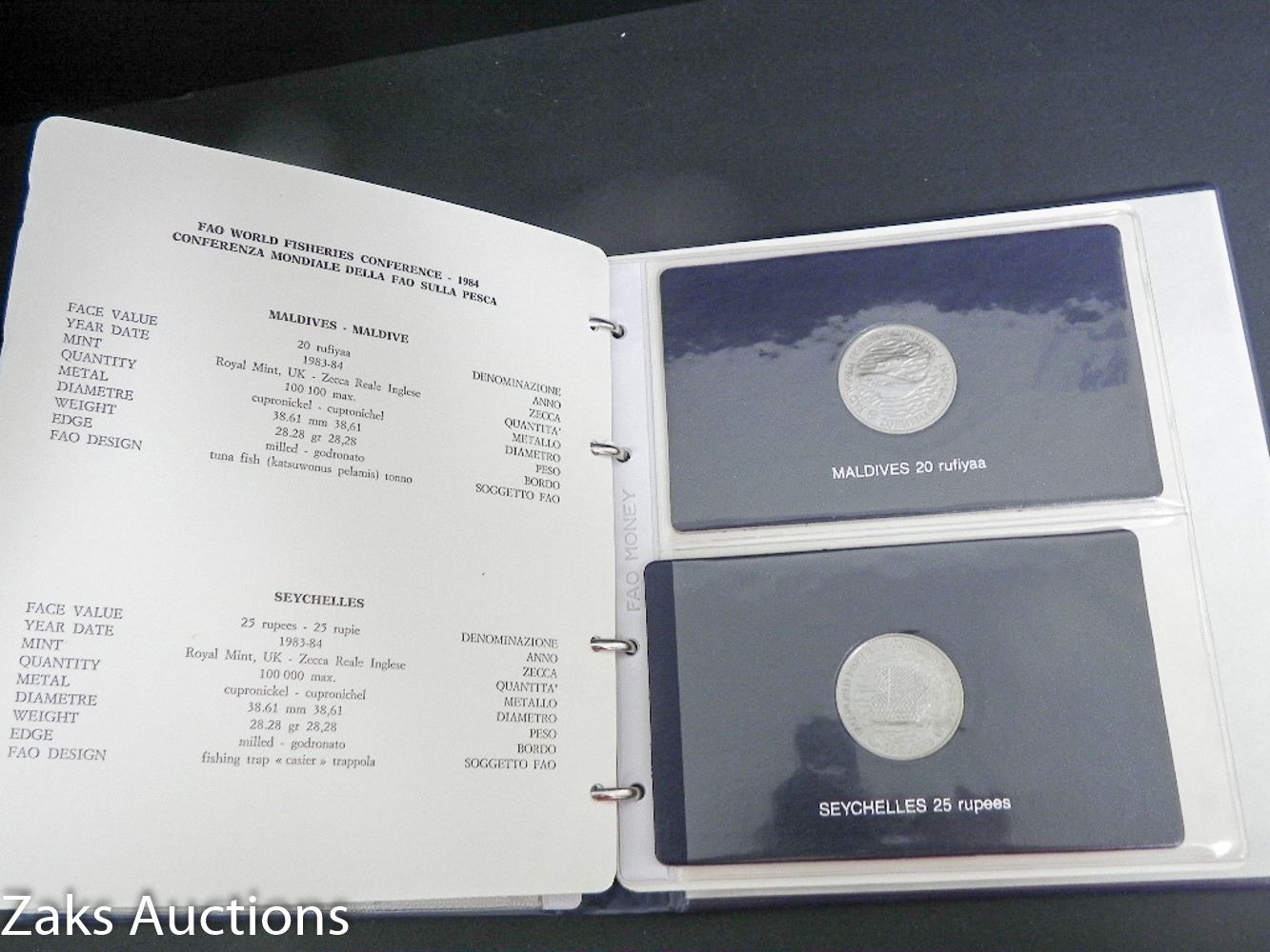 FAO WORLD FISHEREIES CONFERENCE COIN AND SLIDE BOOK. COINS ARE OF VARIOUS METALS INCLUDING SILVER