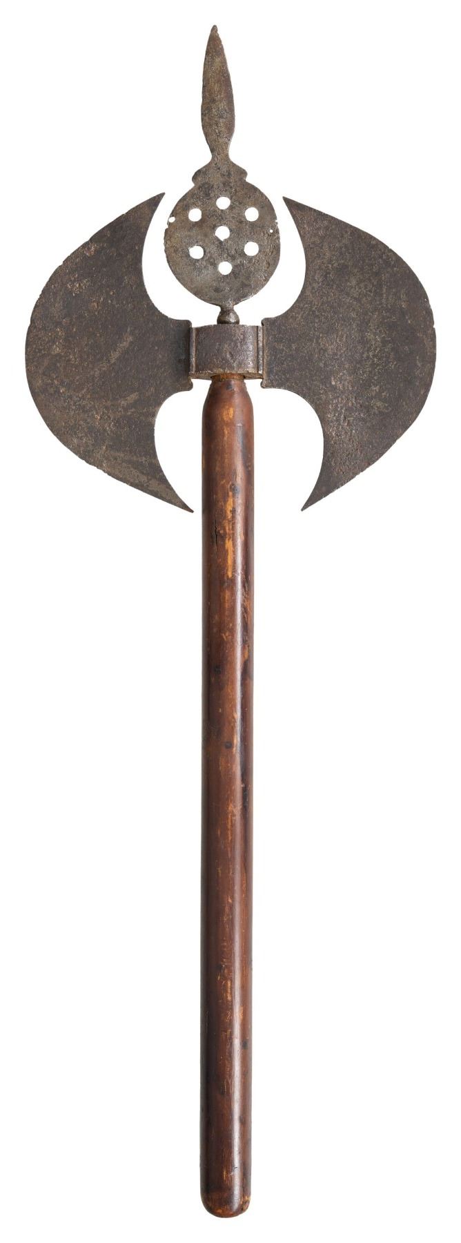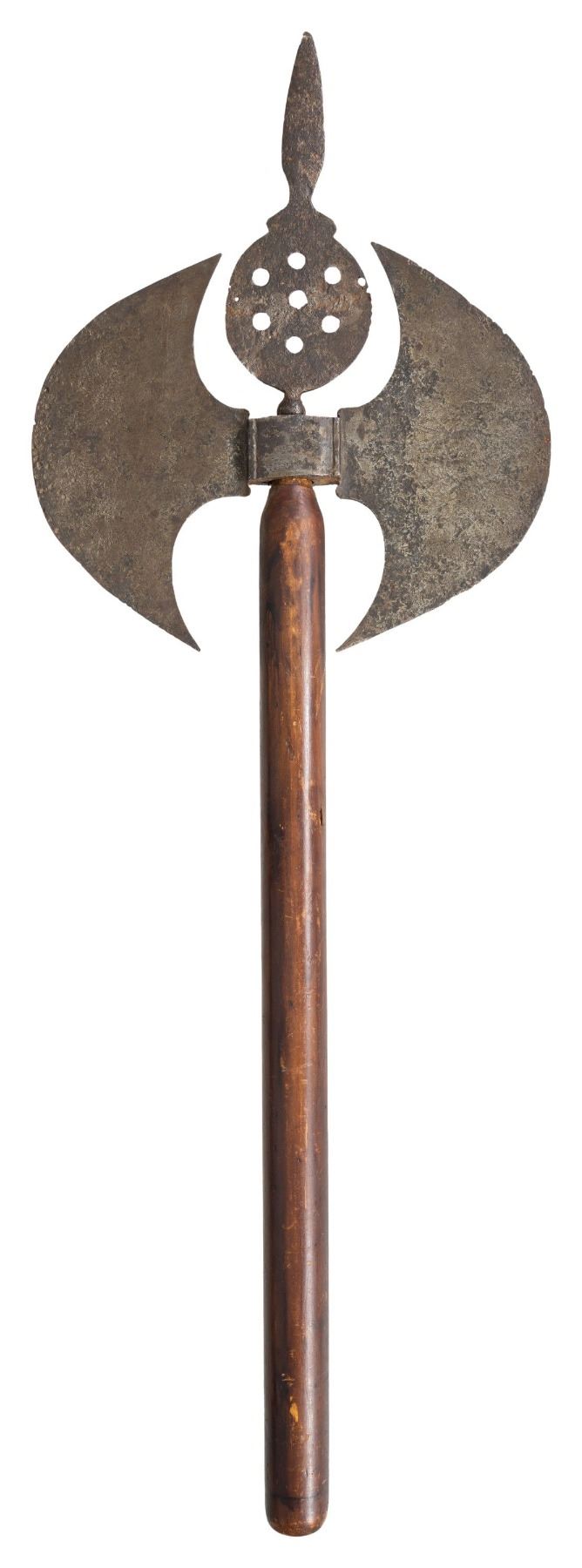 An interesting early Far Eastern double bladed halberd ax measuring 301/2" in length and 10 1/2" from edge to edge. The crescent shaped iron blades have etched decorations and what appear to be Chinese writings. The iron blade are so pitted it is difficult to discern all the markings. A flat spike with a rounded base bisects the blades at the top. The current haft is about 21" long and seems to be early, but is likely not original to the head. CONDITION: iron has a dark patina but may have been cleaned in the distant past. The haft has the usual scuffs and scrapes. PROVENANCE: Estate Collection of Nicholas Apergis. (02-24694/BF). $400-600.