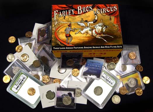 FARLEY CIRCUS BOX WITH COLLECTION OF WITH OLD STYLE COINS