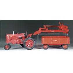 FARMALL 400 TRACTOR WITH CART AND ATTACHMENTS.  The red Farmall tractor has a detachable scoop or plow, and a McCormack red four-wheeled farm cart to accompany it. SIZE:  Tractor only is approximately 9” l., cart approximately 8” l.  CONDITION: Tractor has paint loss on some of the high points.  Otherwise, paint is generally good overall and structurally sound. 1-4671  (150-300)