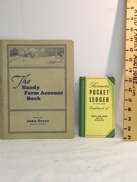 GR OF 2, 1938 JOHN DEERE HAND FARM ACCOUNT BOOK AND 1956 POCKET LEDGER, VERY GOOD CONDITION.