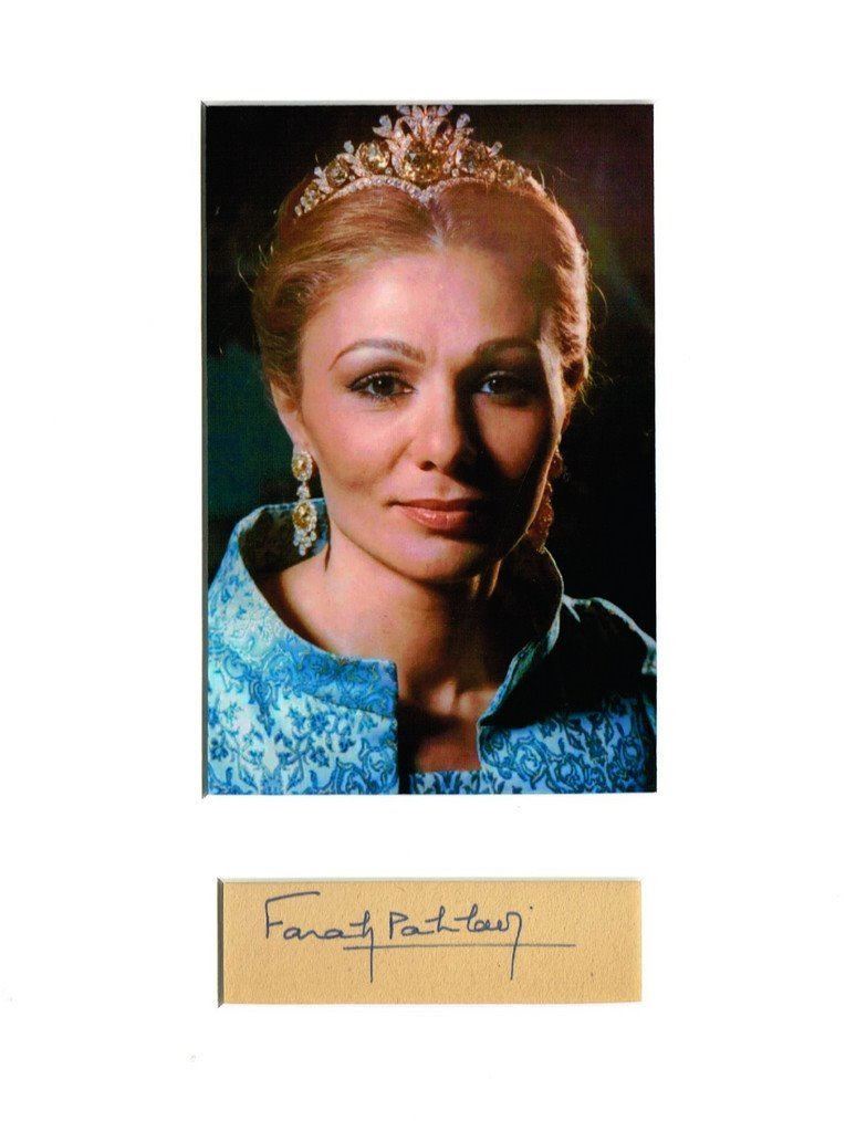 An autograph from Empress Farah (consort of Mohammad Reza Pahlavi, Shah of Iran). Professionally mounted and framed.