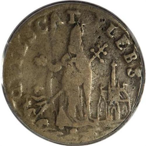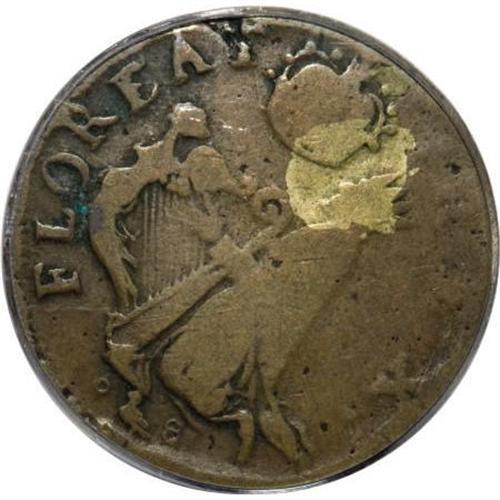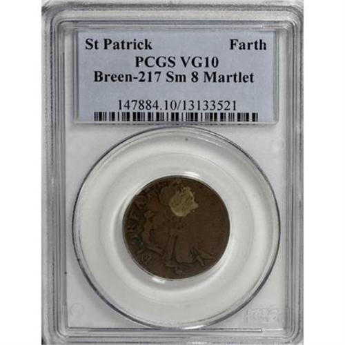 <B>(1670-75) FARTH St. Patrick Farthing VG10 PCGS.</B></I> Breen-217, which he considered "very rare." This Breen variety has an annulet, a small 8, and a martlet below the king. A martlet is a heraldic bird without feet. The brass splasher is mostly southeast of the crown. This chocolate-brown representative has well outlined types. The church is particularly sharp, as is FLOREAT. A few letters in the peripheral legends are faint. A few flecks of aqua debris are present near the waist of the harp angel. Careful inspection locates a few moderate obverse marks near 3 o'clock. Listed on page 39 of the 2008 <I>Guide Book;</B></I> however, all reported prices are for common varieties. This Breen variety did not appear in the offering of colonials from the John J. Ford Collection.<BR><BR><b>Shipping:</b> Coins & Currency (<a target="_blank" href="http://www.heritageauctions.com/common/shipping.php">view shipping information</a>)