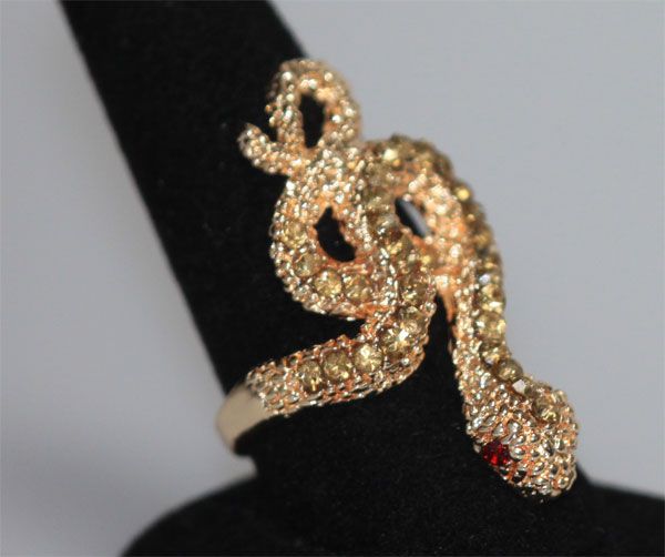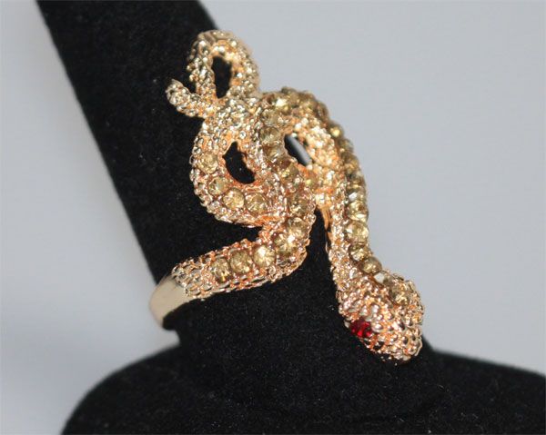 FASHION JEWELRY BLOOD RED AND LIGHT GREEN CZ SNAKE BRAS **|**|** FASHION JEWELRY LIGHT GREEN AND BLOOD RED CZ SNAKE BRASS RING ADJUSTABLE RING SIZE ; MSRP: $0