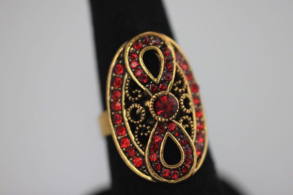 FASHION JEWELRY BRASS RING; SYNTHETIC CZ **|**|** FASHION JEWELRY BRASS RING; OVAL SHAPED; SYNTHETIC RED CZ; ADJUSTABLE SIZE ; MSRP: $0