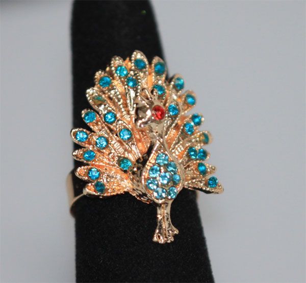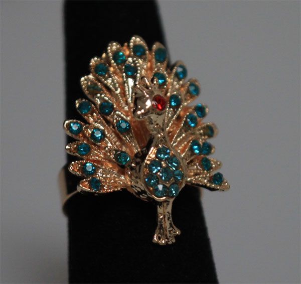 FASHION JEWELRY LIGHT BLUE CZ AND RED CZ PEACOCK SHAPED **|**|** FASHION JEWELRY LIGHT BLUE AND RED CZ PEACOCK SHAPED BRASS RING ADJUSTABLE RING SIZE ; MSRP: $0