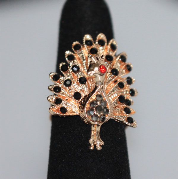 FASHION JEWELRY MULTI-COLORED CZ PEACOCK SHAPED BRASS R **|**|** FASHION JEWELRY BLACK, GREY, AND RED CZ PEACOCK SHAPED BRASS RING ADJUSTABLE RING SIZE ; MSRP: $0