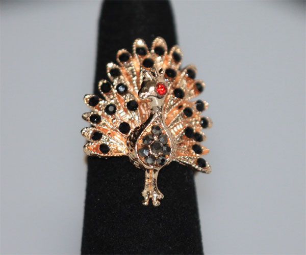 FASHION JEWELRY MULTI-COLORED CZ PEACOCK SHAPED BRASS R **|**|** FASHION JEWELRY BLACK, GREY, AND RED CZ PEACOCK SHAPED BRASS RING ADJUSTABLE RING SIZE ; MSRP: $0