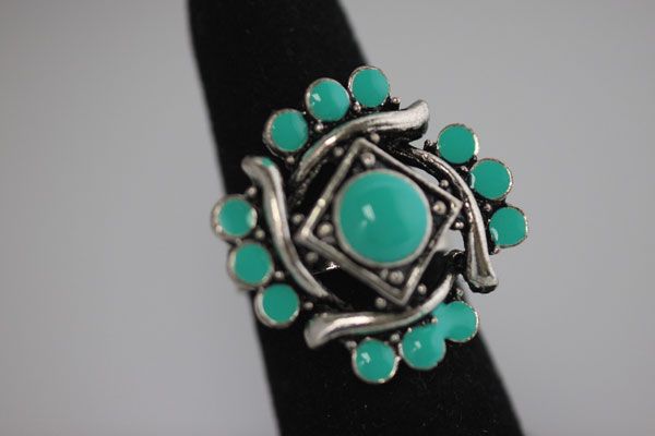 FASHION JEWELRY SYNTHETIC TURQUOISE COLORED BRASS RING **|**|** FASHION JEWELRY; FLOWER SHAPED; SYNTHETIC TURQUOISE COLORED BRASS RING; ADJUSTABLE SIZE ; MSRP: $0