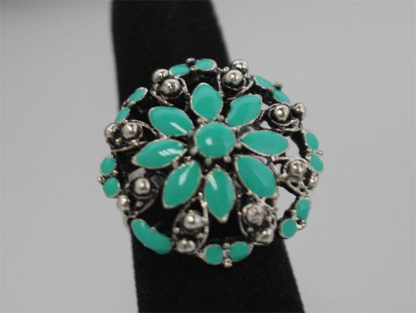 FASHION JEWELRY; SYNTHETIC TURQUOISE COLORED BRASS RING **|**|** FASHION JEWELRY; CIRCULAR SHAPED; SYNTHETIC TURQUOISE COLORED BRASS RING; ADJUSTABLE SIZE ; MSRP: $0