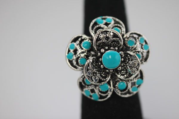 FASHION JEWELRY SYNTHETIC TURQUOISE COLORED BRASS RING **|**|** FASHION JEWELRY; FLOWER SHAPED; SYNTHETIC TURQUOISE COLORED BRASS RING; ADJUSTABLE SIZE ; MSRP: $0
