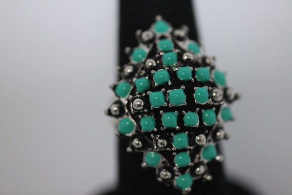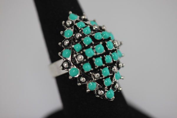 FASHION JEWELRY; SYNTHETIC TURQUOISE COLORED BRASS RING **|**|** FASHION JEWELRY; DIAMOND SHAPED; SYNTHETIC TURQUOISE COLORED BRASS RING; ADJUSTABLE SIZE ; MSRP: $0