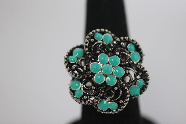 FASHION JEWELRY; SYNTHETIC TURQUOISE COLORED BRASS RING **|**|** FASHION JEWELRY;FLOWER SHAPED; SYNTHETIC TURQUOISE COLORED BRASS RING; ADJUSTABLE SIZE