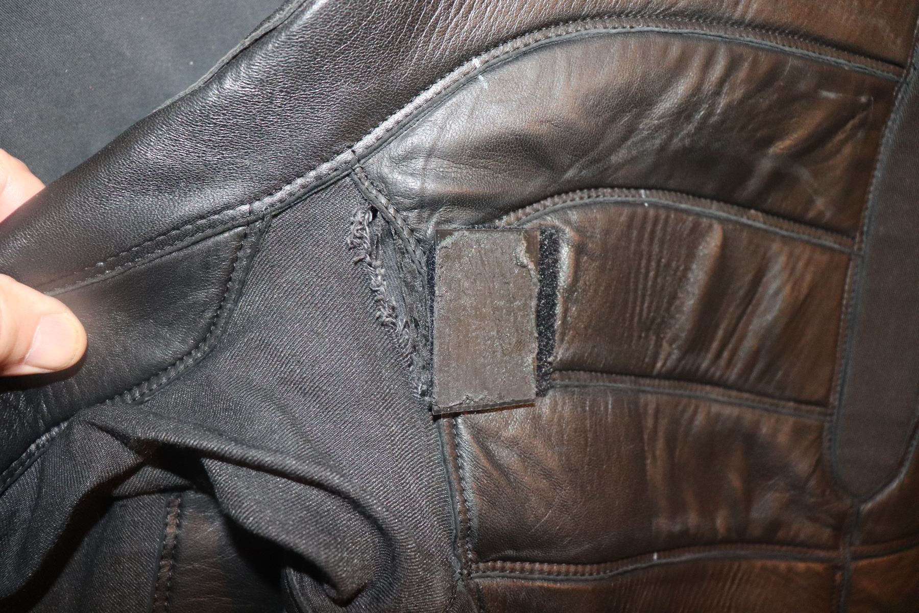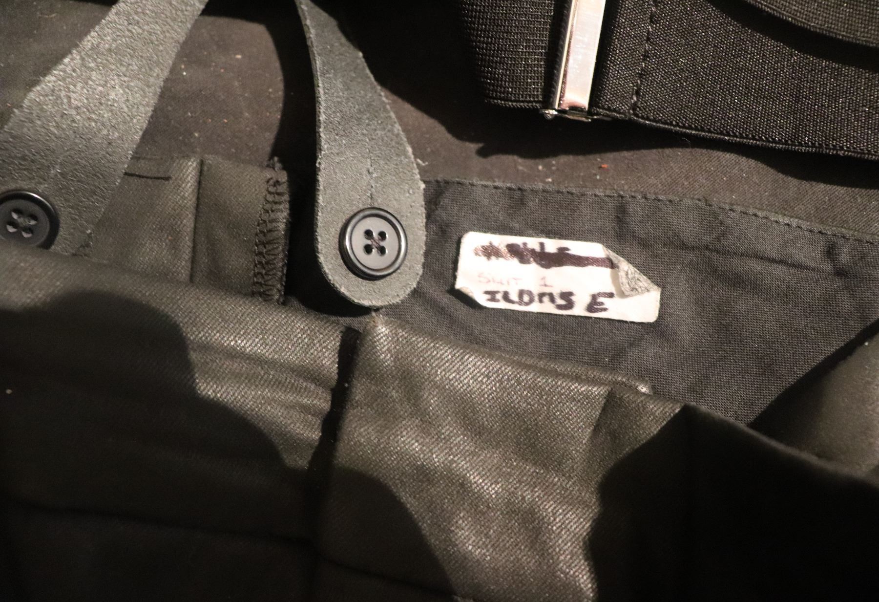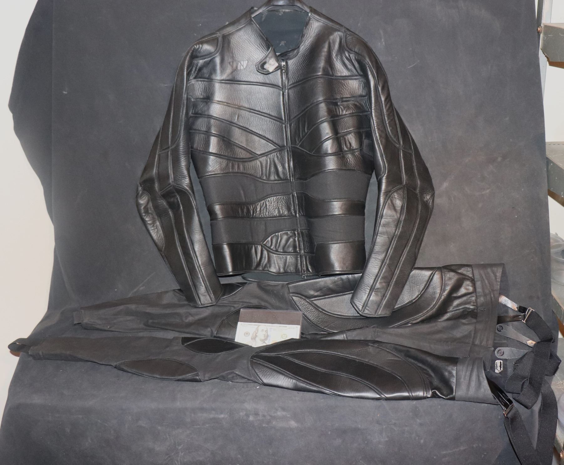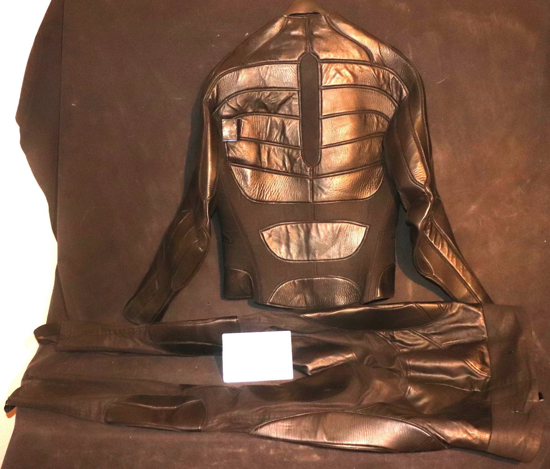 Leather jacket and pants with suspenders. Still has velcro to attach shoulder holster but there is a tear which caused the suit to be replaced during production. Genuine Blockbuster at $760 Million Box Office!