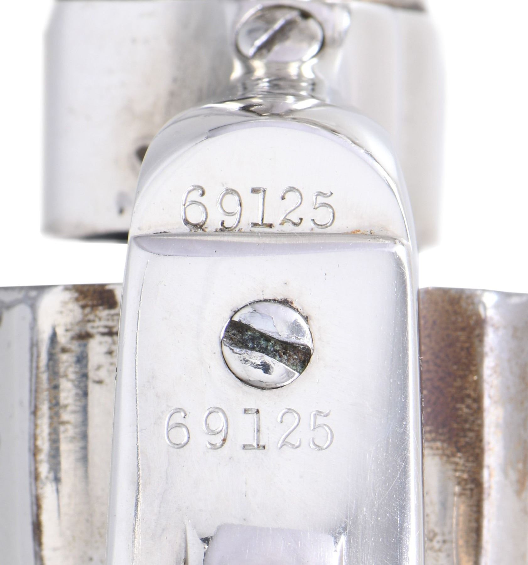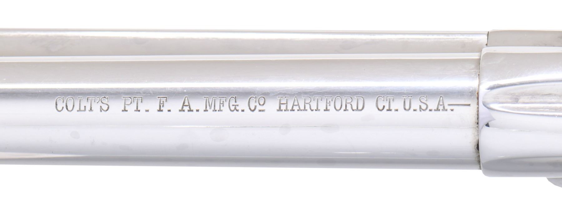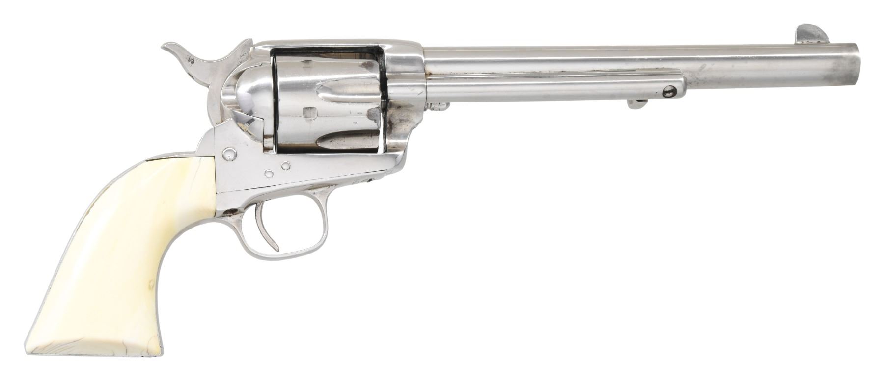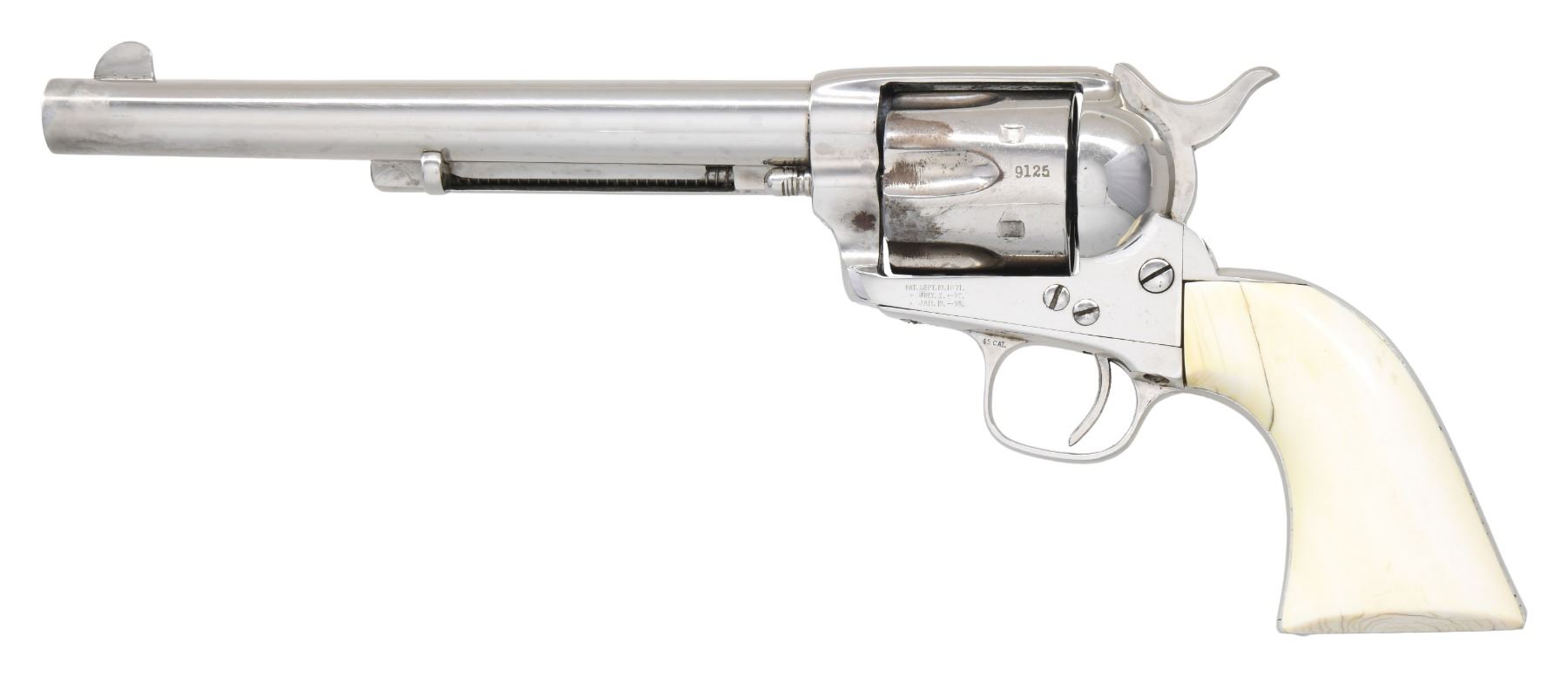 SINGLE ACTION ARMY FACTORY SHIPPED TO CHARLES GOODNIGHT. Cal. 45 Colt. S# 69125. Bbl 7.5". Charles Goodnight (1836-1929) led such a full and extraordinary life, we can barely scratch the surface. Born born March 5, 1836, Goodnight was brought to Texas by his Mother and Step Father in 1846. His early adult life consisted mainly of running cattle up the Brazos River to Keechi Valley located in Palo Pinto County, TX. Goodnight served with the local militia, fending off attacks from the increasingly hostile Comanche. He later joined forces with Capt. J.J. Cureton's Texas Rangers, as guide and scout. In December 1860, Charles Goodnight led Capt. "Sul" Ross and the Texas Rangers to the Comanche encampment, "The Battle of Pease River" and the recapture of Cynthia Ann Parker followed. As a side note, it is ironic that years later, Goodnight himself treated with Quanah Parker, the son of Cynthia Ann, who became the Comanche's last great war chief. For 2 beef cows every other day, Quanah and his people agreed not to disrupt or drive off cattle belonging to the JA Ranch (more on that later). During the Civil War Goodnight fought with Rangers, attached to the Frontier Regiment pursuing outlaws and marauding Natives. After the Civil War, it was back to running cattle, Goodnight and his partner Oliver, Loving established the Goodnight-Loving Trail that spanned from Young County, TX to Cheyenne, WY. Palo Duro Canyon had, until 1874, been the Comanche's secret hideout in the vast Llano Estacado of the Panhandle. It was there, in 1876, Goodnight carved out a new ranch. In partnership with the investor John Adair, by 1885, the JA Ranch reached its maximum of 1,325,000 acres on which grazed 100,000 head of Goodnight's carefully bred cattle. He managed the ranch until 1888. This revolver is listed in the Colt Factory records as having been shipped to "C. Goodnight" on October 3, 1881 in a 6 gun shipment. Revolver bears a nicely reapplied full nickel finish with all marking remaining crisp. 1 Piece smooth white grips. 3 line patent date on left side of frame. 1 Line block letter bbl address. Left front of trigger guard bow stamped "45 Cal". Matching numbers on Frame, trigger guard, Cyl and butt. Charles Goodnight's influence has carried on to modern day pop culture, being the inspiration for Woodrow F. Call, who was played by Hollywood great Tommy Lee Jones in "LONESOME DOVE". In Taylor Sheridan's miniseries, "1883", Sheridan himself appears in two episodes reprising the role of the legendary Goodnight. In "1923" Sheridan gives a tip of the hat to the JA Ranch and Goodnight. UNATTACHED ACCESSORIES: Copy of Colt Factory Archive letter confirming features, recipient and ship date. CONDITION: metal retains 95% reapplied nickel with spots of corrosion appearing on front portion of cyl and at either side of frame ahead of cyl. Good plus grips. Left side panel has vertical full length repaired crack approx 5/8" from rear of frame. Mainspring appears slightly weak but functions properly with all 4 clicks present. Very good bore with strong rifling having mild frosting in grooves. What Texas collection could be complete without a Colt's revolver, factory shipped to "The Father of the Texas Panhandle"? (01-26857/BH). ANTIQUE. $20,000-30,000.