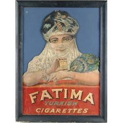 FATIMA CIGARETTES CARDBOARD DISPLAY. Large store die-cut with illustration of a veiled mid-eastern woman promoting Turkish-blend cigarettes. Originally an easel-back type of display. SIZE: Image 21 3/4” w. x 30 1/4” t. CONDITION: Fair to good; inpainting concentrated to bottom quarter background; moisture rippling to surface; random surface chips enclose punctures. PF 1-3657 (100-200)