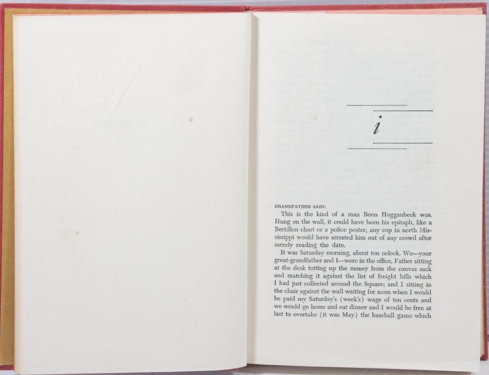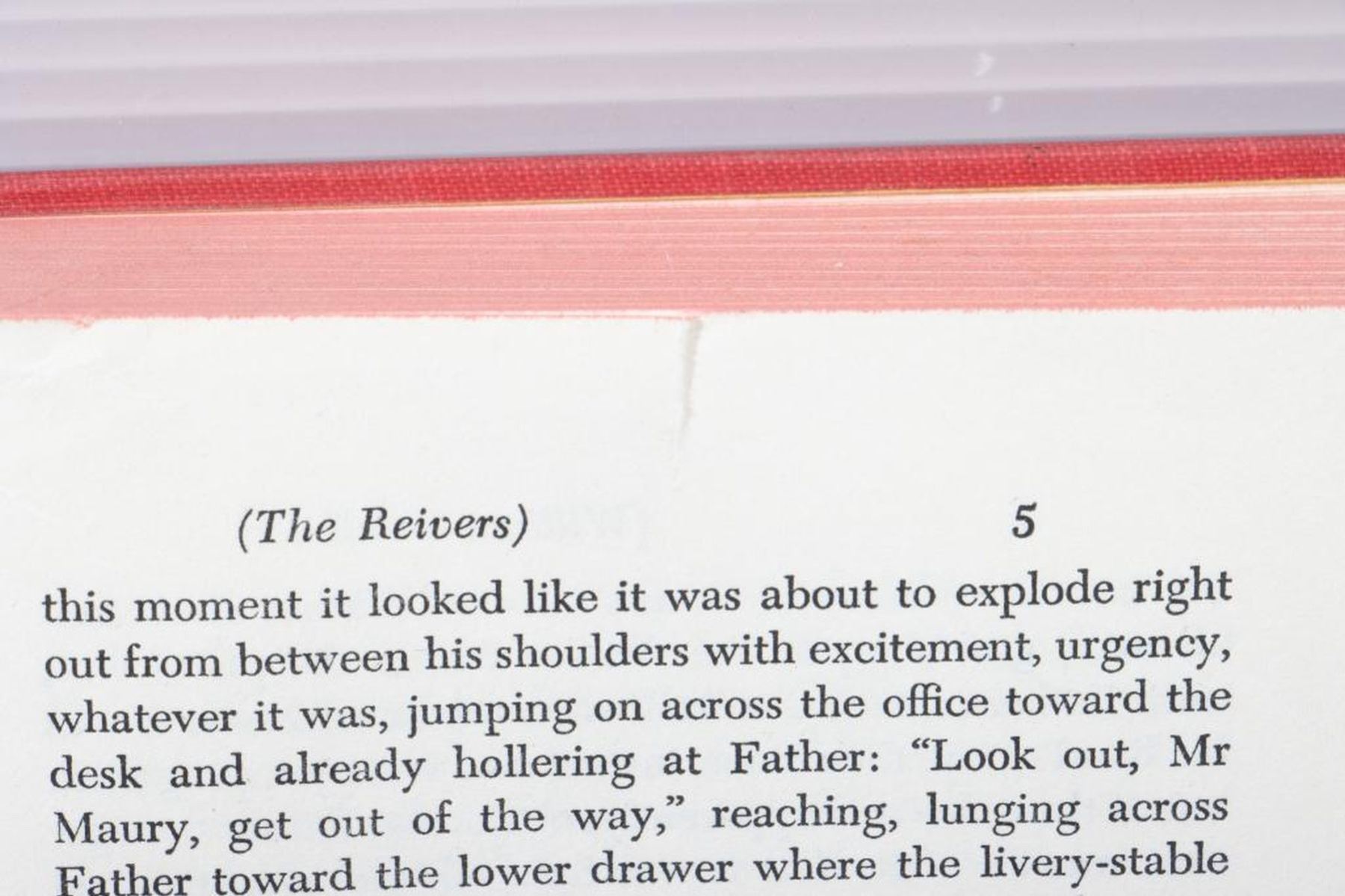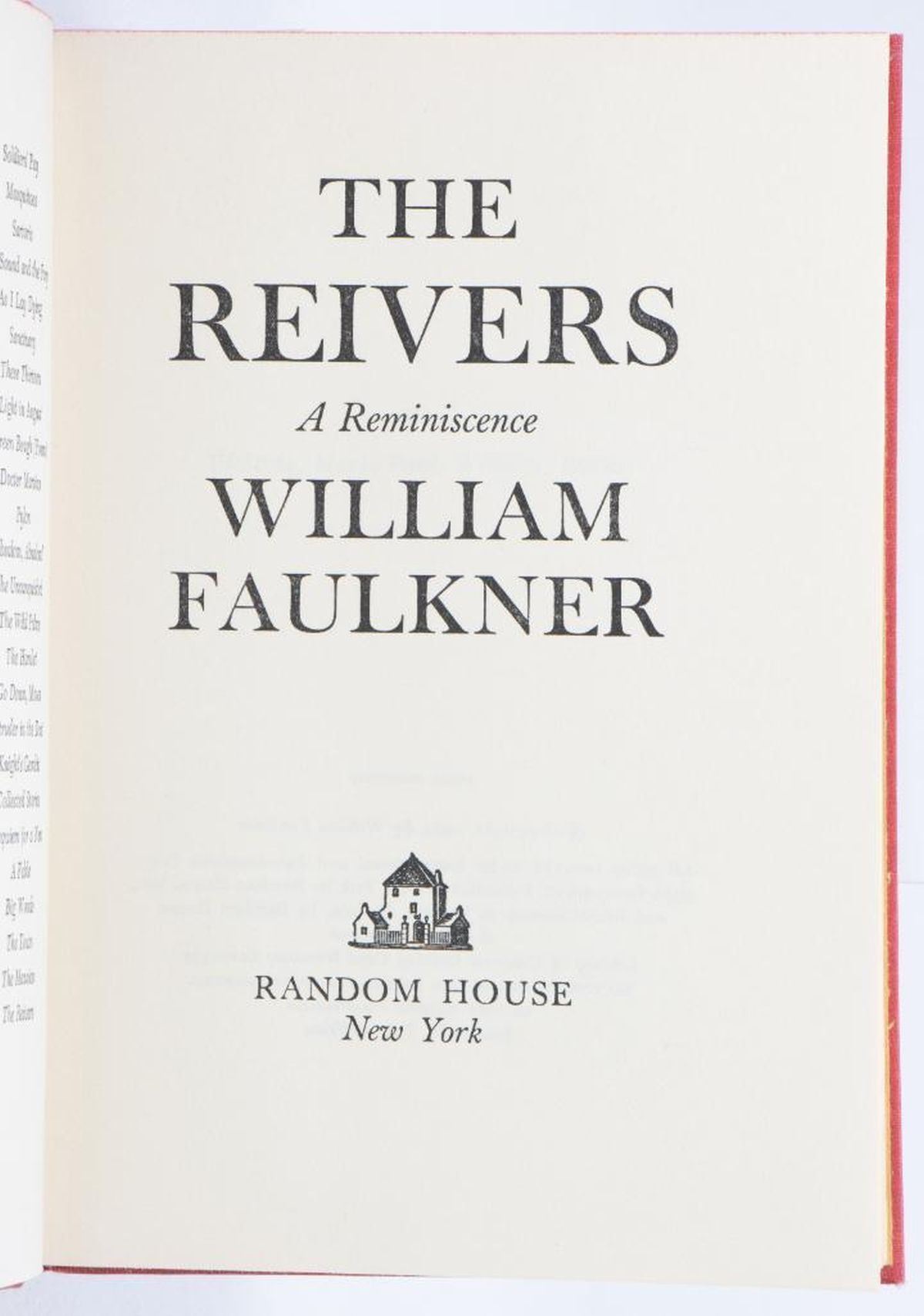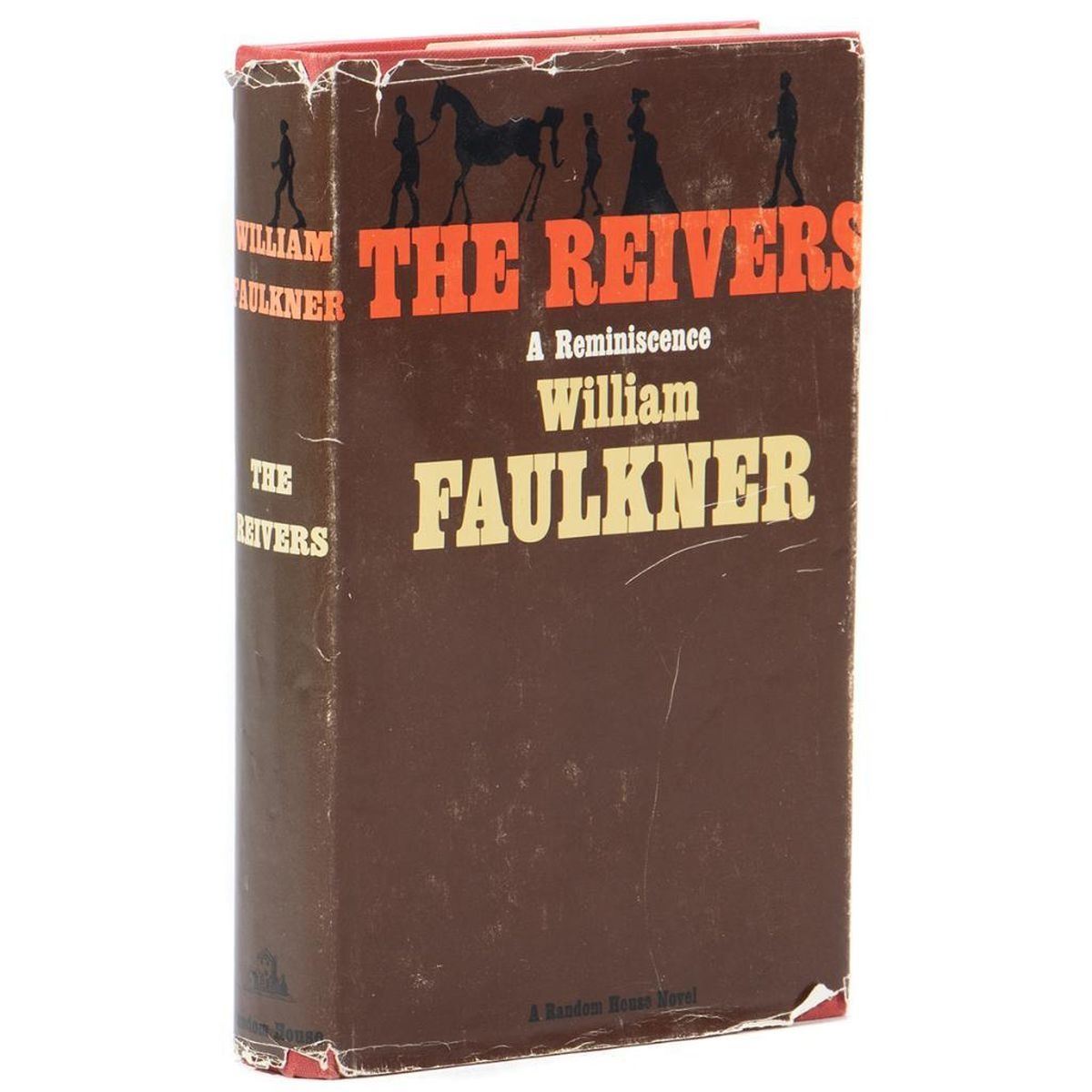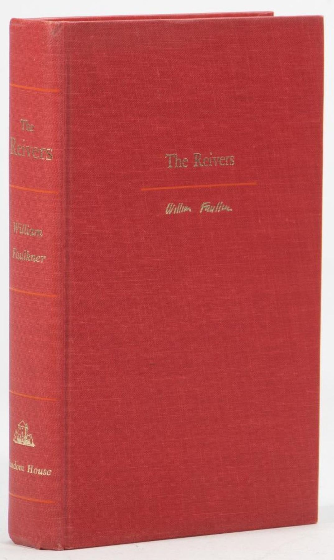 The Reivers: A Reminiscence. New York: Random House: 1962. First edition. 8vo. Red cloth with gilt, top edges stained. Very Good; there are about three small (1/16" and smaller) stains on the first and facing page; page 5 has a tear on the fore-edge; penciled owner's name. The dust jacket is Fair-Good.