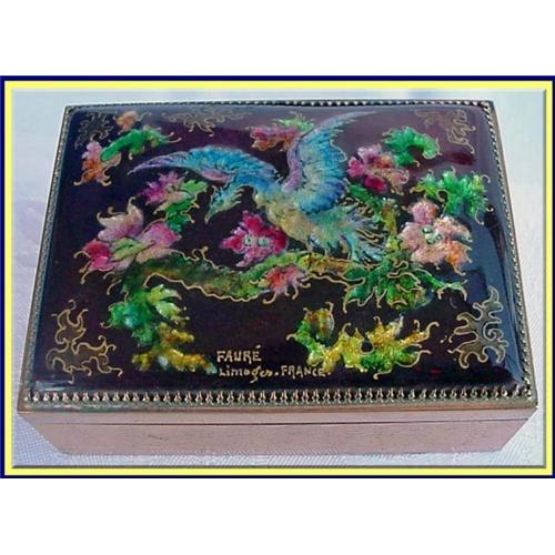 <tr><td><font size="2" face="Arial, Helvetica, sans-serif"><strong><font color="#000033">Title:</font></strong>FAURE LIMOGES ENAMEL O COPPER BOX EXOTIC BIRD </font></td></tr>