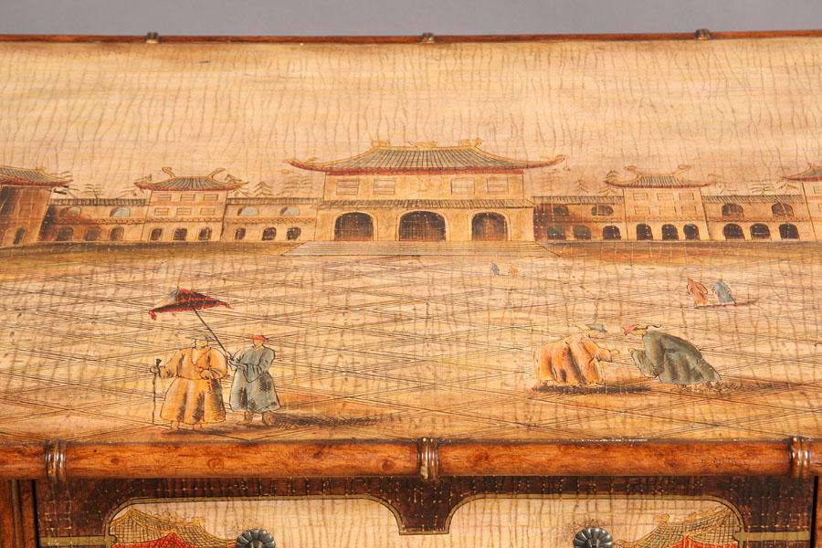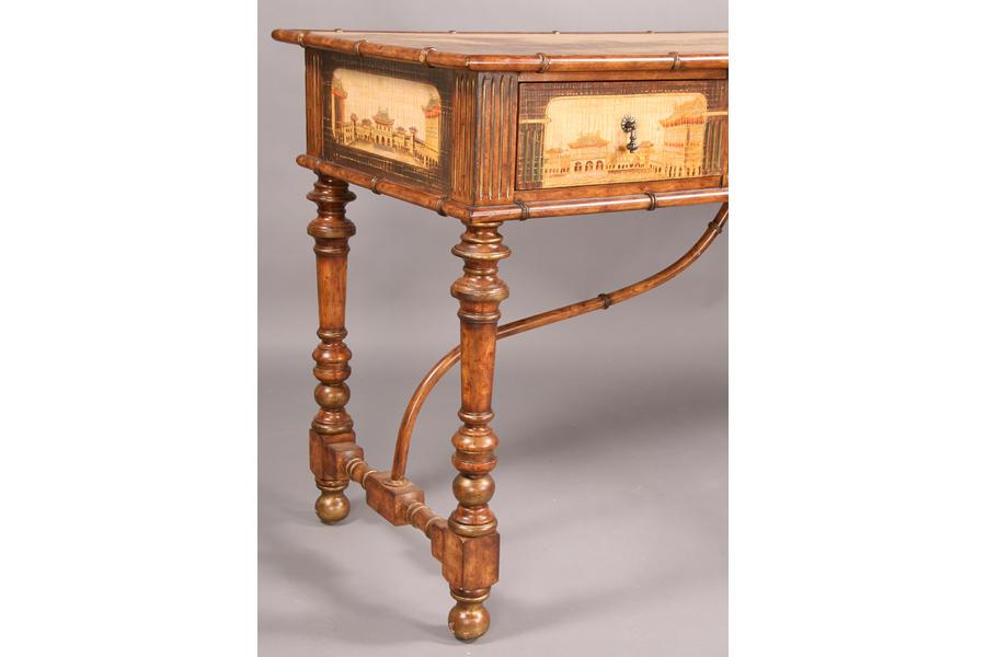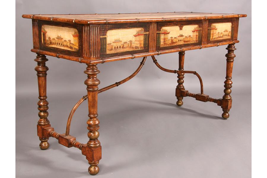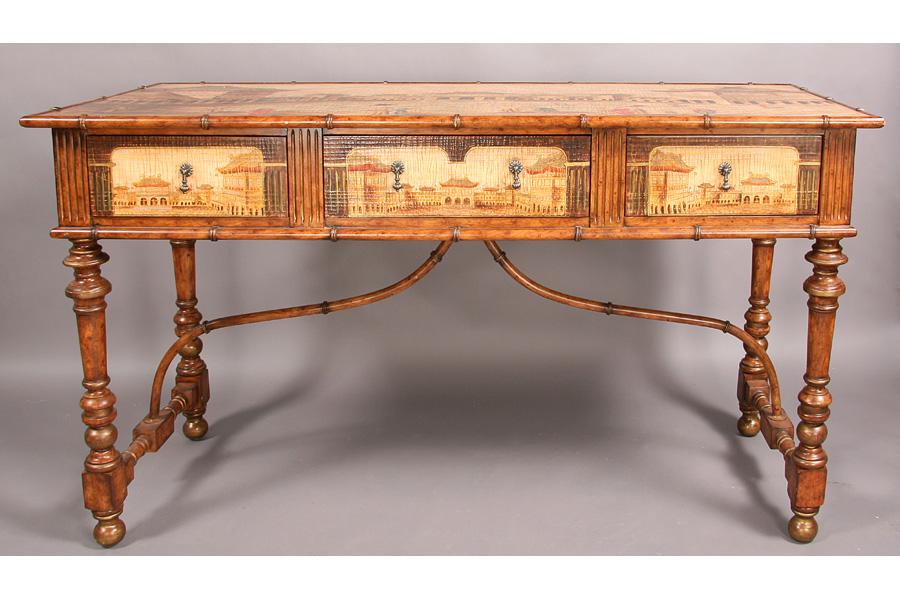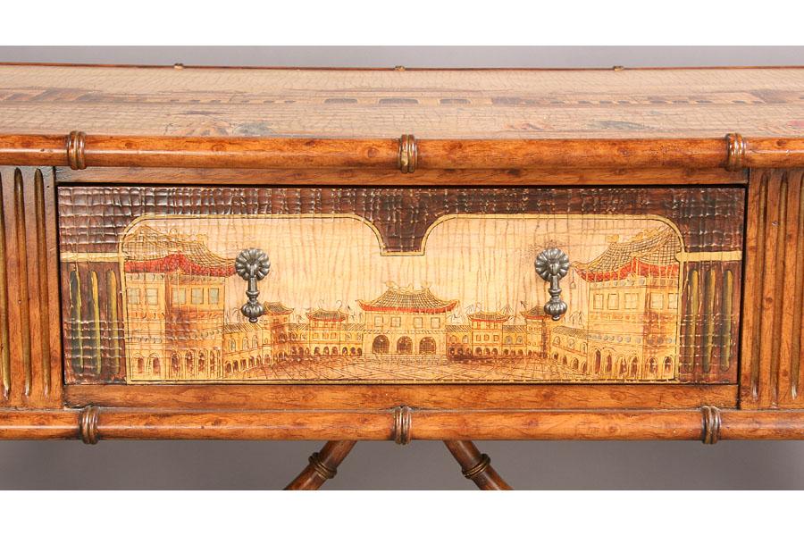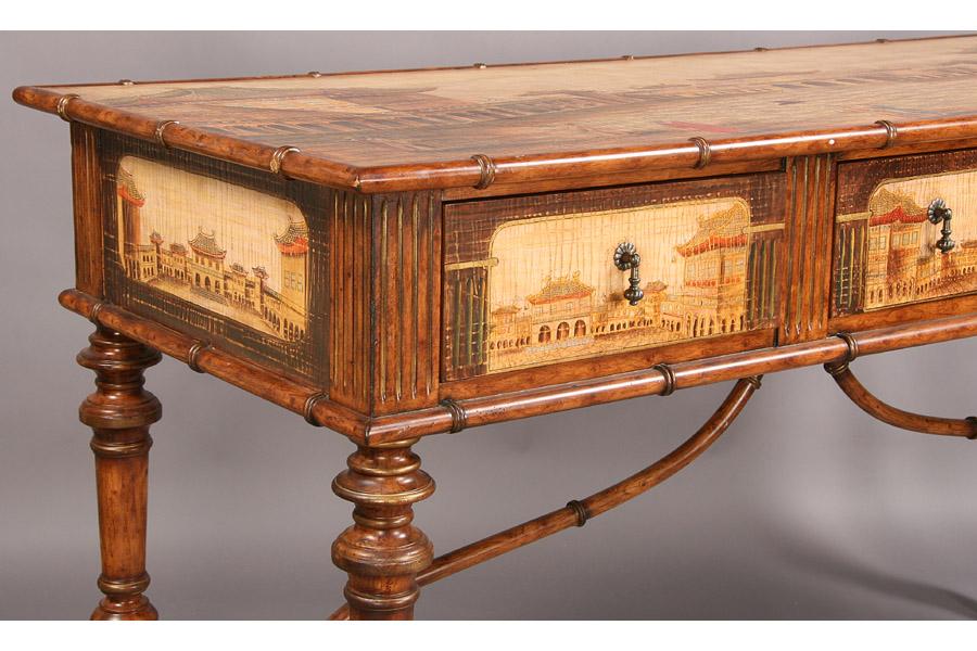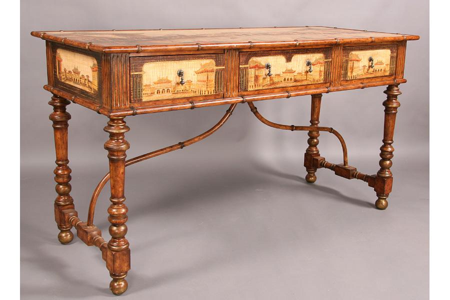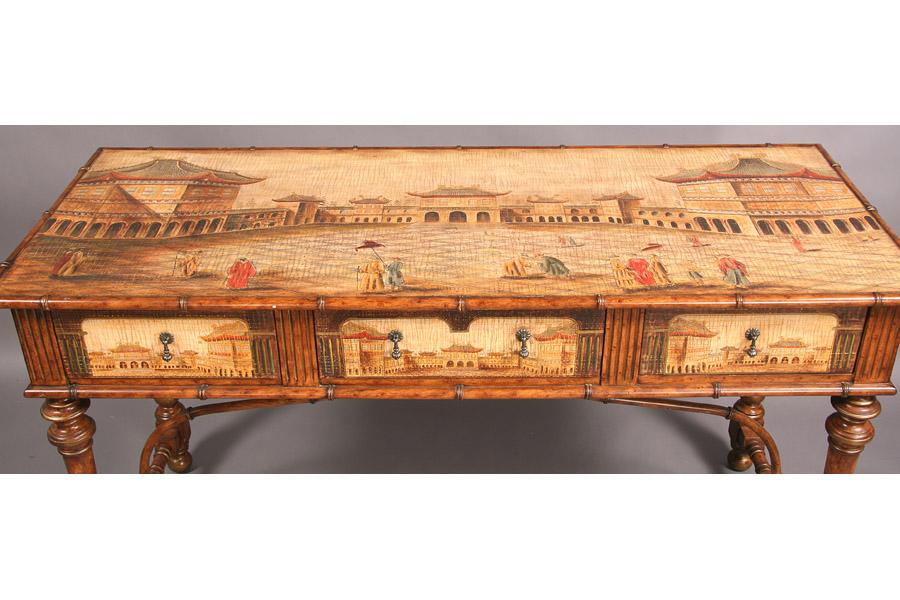 Chinoiserie decorated faux bamboo server with three drawers supported on turned legs with iron stretcher. Dimensions: Ht: 40.5" Width: 74" Depth: 30". ***PLEASE NOTE: All property shall be paid for by the purchaser within five (5) business days of the sale. Kamelot Auctions accepts cash (In house only), personal checks, certified checks and money orders. We do not accept credit cards or Paypal under any circumstances. Please note our policy regarding payments from International buyers: The only acceptable method of payment is a bank wire/bank transfer. For invoices more than $1000, there is no additional fee for this service. For invoices less than $1000, please include an additional $25 wire fee. We will be happy to forward our bank wiring information after the completion of the auction. Thank you for your understanding and cooperation. All purchases must be removed within 15 business days after an auction. Property not removed from our facility after 15 business days will be moved to an off-site storage facility at a charge of $10.00 per day payable by the buyer. Kamelot does NOT provide shipping services or estimates. However, we recommend the following independent shipping services: Antique Transport Co. at antiquetransport@cs.com, Farren Transport at farrentransport@comcast.net or All Points Shipping at jb@allpointsshippingnj.com for quotations and shipping arrangements for furniture and other large items that would require a blanket wrap shipping company. For quotations and shipping arrangements for smaller items that would traditionally be shipped through UPS, please contact The UPS Store at store4744@theupsstore.com or The Packaging Store at hrpa112@aol.com. Clients are welcome to pick up their items from our location or make their own shipping arrangements.