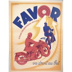 FAVOR MOTORCYCLE AND BICYCLE POSTER. One sheet French poster with a silk-screen quality featuring color graphics of a Favor motorcycle, moped, and bicycle lithographed by Delattre, Paris, circa 1930’s. SIZE: 47” w. x 63” h. CONDITION: Unmounted, in very good condition. PF 1-3341 (300-500)