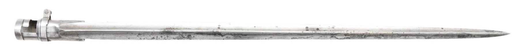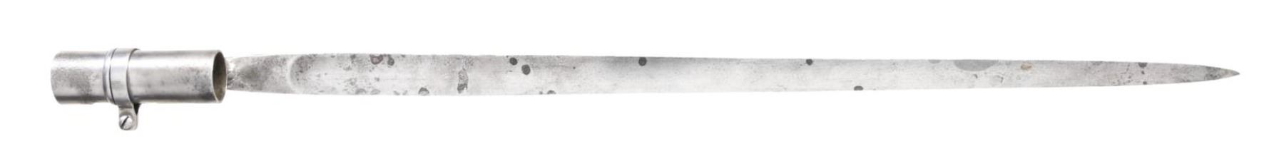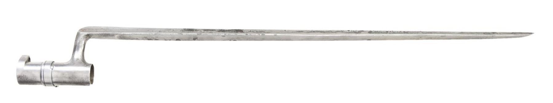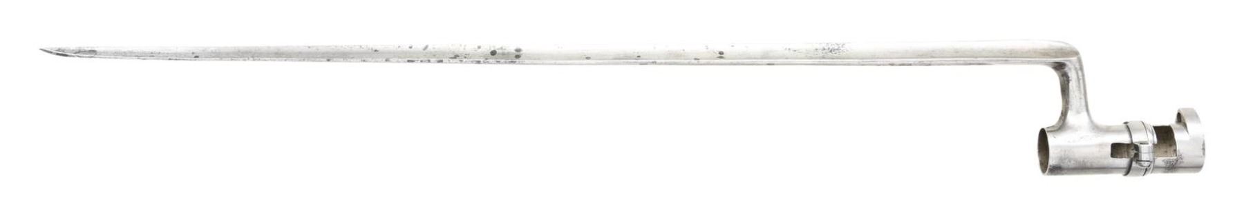 A rare Confederate bayonet used on the Fayetteville rifle, as well as the Republic of Texas rifle, manufactured by Tryon. Overall length is 22 3/4" with a blade length of 19 7/8”. The flute is 18 7/8”, and the heavily hollow ground back flutes extend the entire length of the blade through the elbow. The socket is 3” long and the locking ring is present. A full explanation of this bayonet may be seen on page 39 of Hardin’s landmark work, “The American Bayonet 1776-1964.” CONDITION: the condition of this bayonet should be considered extraordinary given the extreme field use seen by most of these bayonets. This example has a light gray patina with only scattered minor staining with no notable damage or flaws. The top of the socket has a small amount of barely noticeable cleaned pitting. PROVENANCE: from the Lifelong Collection of Robert "Mike" Bricker. (02-22608/BF). $800-1,200.