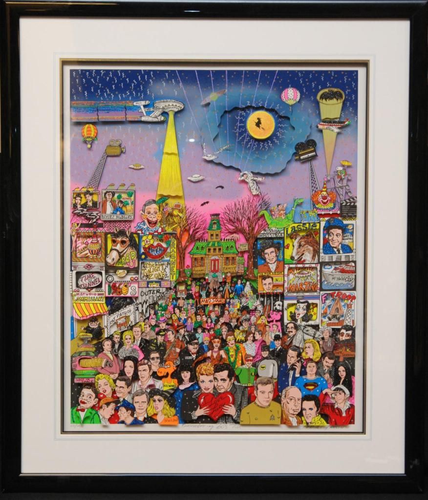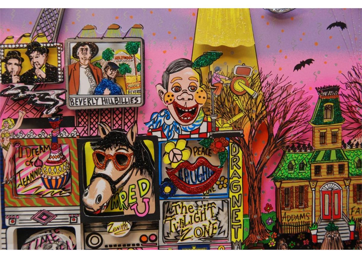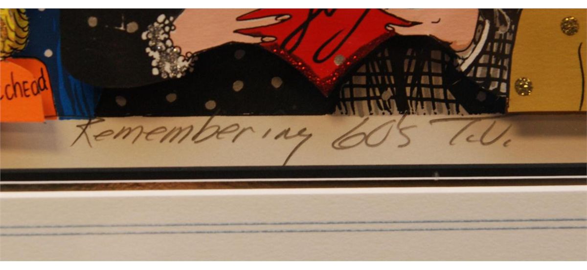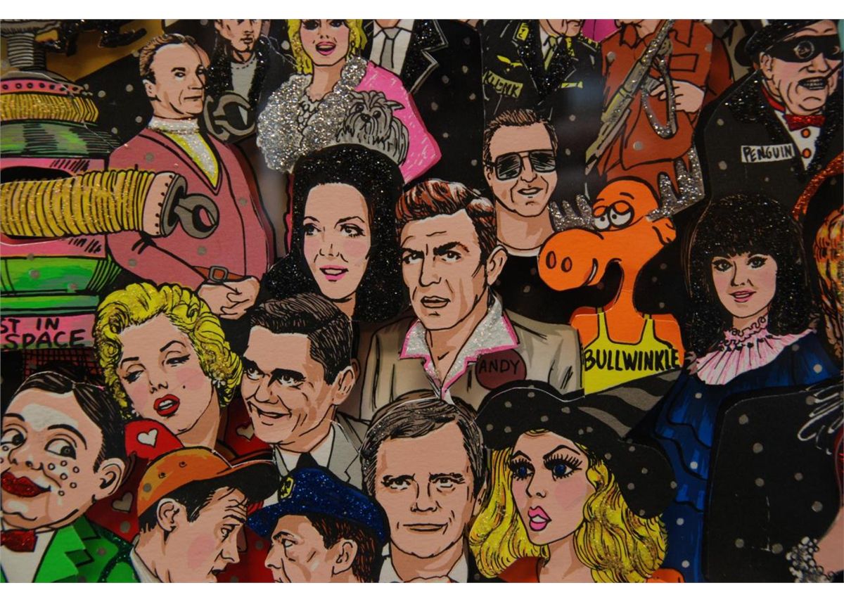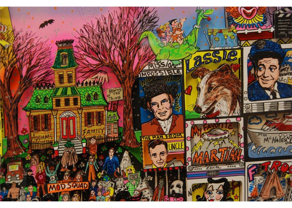 Charles Fazzino (AMERICAN, 1955) 3-D serigraph. Pencil title to lower center "Remembering 60's T.V.". Pencil signed lower right. Pencil numbered 64/400 to lower left. Measures 28 1/2" height x 23 1/4" width + 4 3/4" mat & frame (72.3cm x 59cm + 12cm).