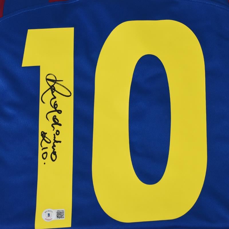 This is a replica 2006 F.C. Barcelona soccer Jersey autographed by Ronaldinho. This piece is presented with a Certificate of Authenticity from Beckett with a QR code and certification number. Measures approx. 30" x 28" (jersey).