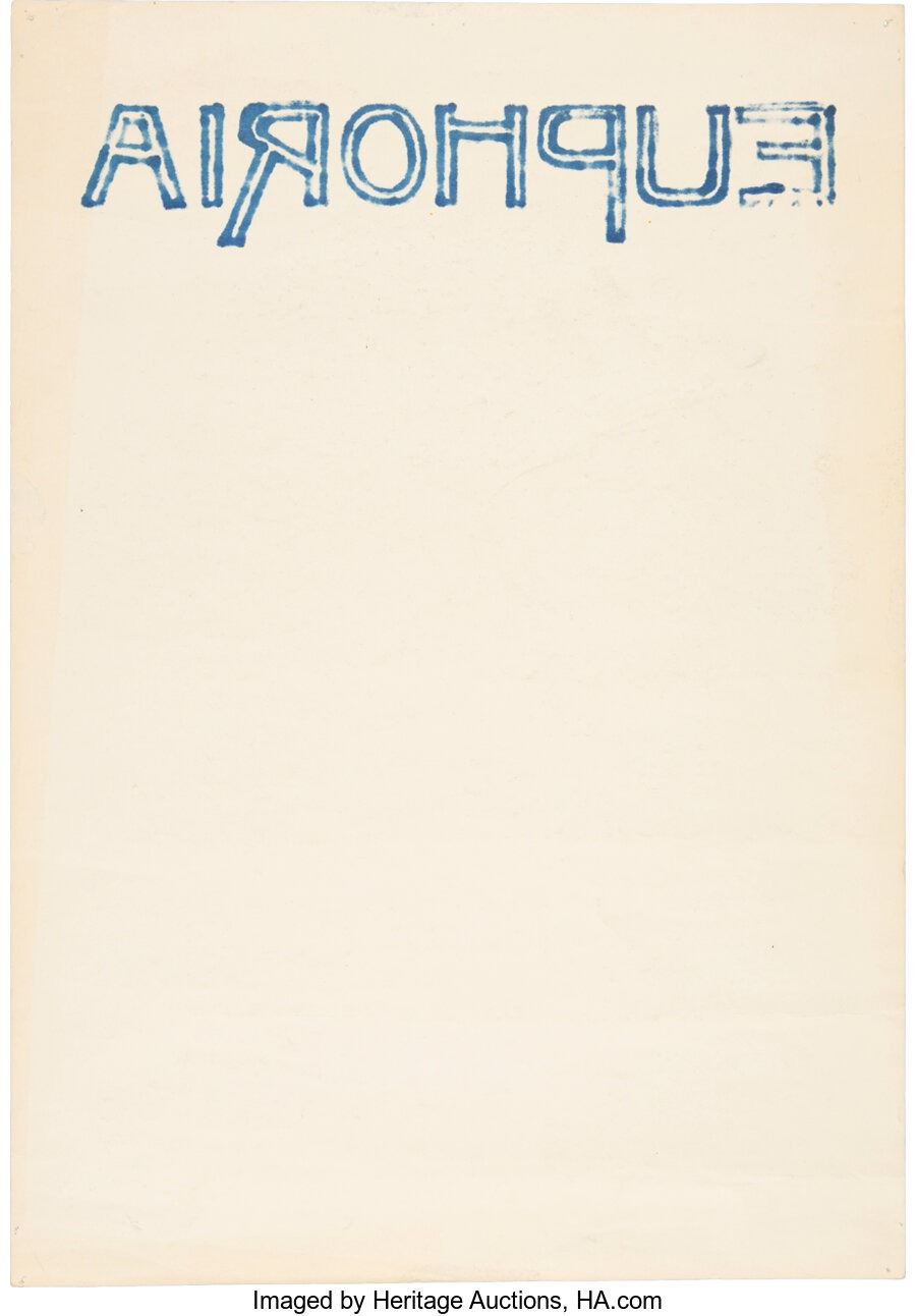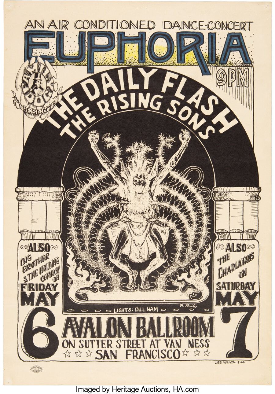 FD-7 "Euphoria" First-Printing Concert Poster with Some Original Hand-Coloring.First-printing San Francisco concert poster for The Daily Flash, The Rising Sons (with Ry Cooder and Taj Mahal), Big Brother The Holding Company (without Janis Joplin yet) and The Charlatans playing at the Avalon Ballroom on Friday and Saturday nights, May 6 7, 1966. Known as FD-7 in the Family Dog numbered series, this poster is one of the "set breakers" that many collectors need for a complete FD set, but many lack. It didn't feature a major band (at least prominently), the shows were canceled, and it was not so much a psychedelic design as it was a cartoon, so the poster was not saved much.