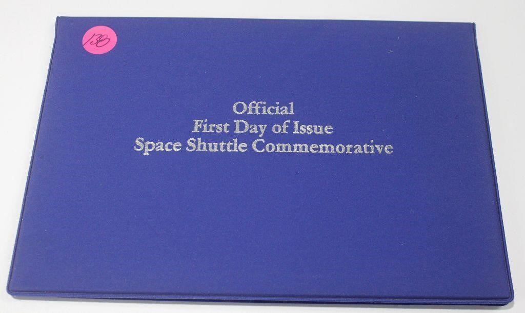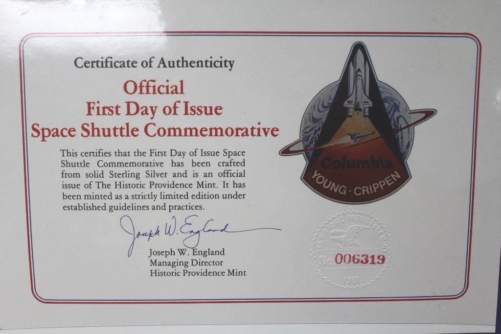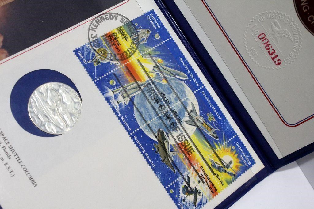 The Official first day of Issue Space shuttle Commemorative coin. #006319 commemorates the first launch of the Space Shuttle (Columbia). A very nice presentation which includes the commemorative stamps from the kennedy space Center.