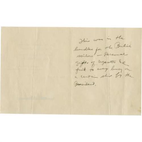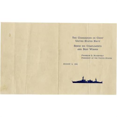 <B>Franklin D. Roosevelt Souvenir of the Atlantic Charter.</B></I> Two pages, 4” x 5”, August 9, 1941, printed on the cover “The Commander-in-Chief United States Navy Sends His Compliments and Best Wishes Franklin D. Roosevelt President of the United States August 9, 1941, printed below the message is the silhouette of a battleship. As U.S. involvement in the European conflict grew increasingly likely, Roosevelt and Churchill convened a secret meeting, held on warships anchored near Newfoundland. The meeting resulted in the Atlantic Charter, a decisive document that set the stage for America's entry into the war. During the meetings, Roosevelt arranged for personal gifts such as cigarettes and fruit to be given to British sailors on certain ships. The card on offer accompanied those gifts. Has two vertical folds, else in near fine condition. <BR><BR><b>Shipping:</b> Flat Material, Small (<a target="_blank" href="http://www.heritageauctions.com/common/shipping.php">view shipping information</a>)