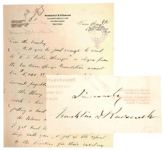 Franklin D. Roosevelt autograph letter signed. Composed on Roosevelt & O'Connor letterhead, Warm Springs, Georgia, 30 September 1927, to his law partner Benjamin F. Crowley, asking him to send a check for $5,360.98 to E.T. Curtis, manager of the Georgia Warm Springs Foundation, to pay for ''June accounts payable.'' FDR remained involved with Warm Springs for the rest of his life; it was there that he died on 12 April 1945. Letter measures 8.5'' x 11''. File holes and some chipping to edges, else near fine condition.