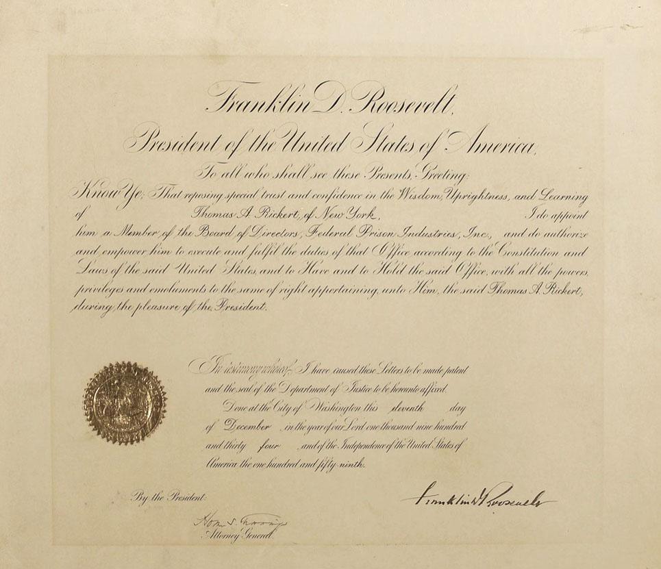 Franklin Delano Roosevelt document signed as President. Dated 7 December 1934, President Roosevelt appoints Thomas A. Rickert of New York ''a Member of the Board of Directors, Federal Prison Industries Inc.'' Signed at the conclusion by Roosevelt, and countersigned by Attorney General Homer S. Cummings. Measures 18.5'' x 16.25''. Light uniform block of toning from previous display, show-through from tape remnants on verso, and a bit of scattered light soiling. The gold foil seal is crisp and intact. Very good condition.