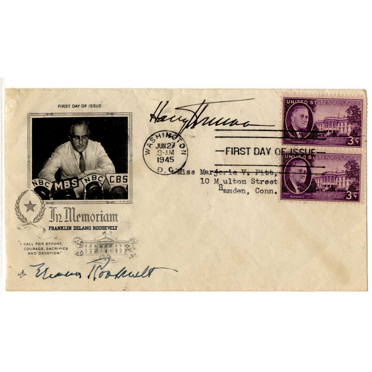 ''In Memoriam Franklin Delano Roosevelt'' first day cover signed by Eleanor Roosevelt and Harry Truman, likely as President. The 6.5'' x 3.5'' envelope, postmarked from Washington, D.C. on 27 June 1945, two months after FDR died, also has two three-cent FDR stamps. Mrs. Roosevelt signs: ''Eleanor Roosevelt'' and the President signs: ''Harry Truman''. Cover featuring a black and white photo of FDR shows minor soiling and creasing, else very good condition. A poignant remembrance.