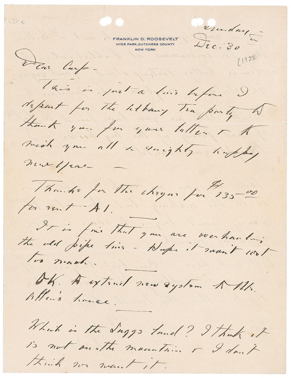 Franklin D. Roosevelt autograph letter signed. Composed on personal stationery on 30 December [1928] 2pp. letter discusses improvements at Warm Springs & potential trouble in Albany. Excerpt: ''...I am sure you can work out a better plan for concessions at Public Pool. A cleaner, better looking stand, good signs, a gas station...maybe a soda fountain...We go to Albany tomorrow, then the trouble begins...'' Measures 8.5'' x 11''. Creasing, punch holes & pencil notation, else fine.