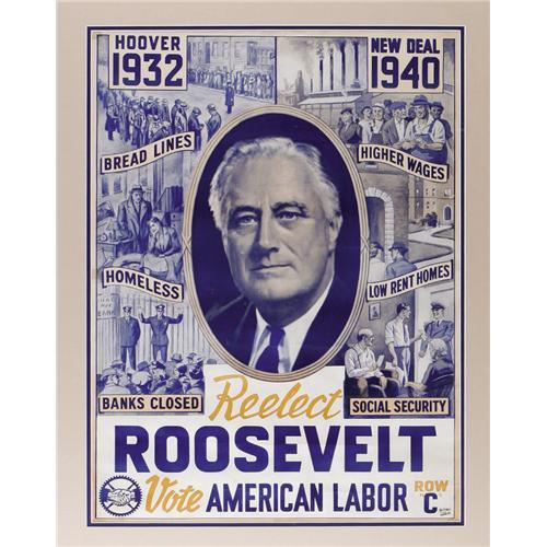 <B>Franklin D. Roosevelt: One of the Most Desirable and Colorful Posters for this Four-Time Presidential Candidate.</B></I> Throughout FDR's presidency, Democratic politicians would trade on fears that only FDR could save the country from another Great Depression. This great poster from New York features a reassuring image of FDR surrounded by vignettes. Those on the left show the ravages of the "Hoover Depression" while those on the right show the benefits of the New Deal. This poster is scarce as well as being a wonderful design. It is in great condition but for minor fold lines as originally distributed. Measures 20" x 27", elegantly double matted and framed to dimensions of 30" x 35".<BR><BR><b>Shipping:</b> Framed (<a target="_blank" href="http://www.heritageauctions.com/common/shipping.php">view shipping information</a>)