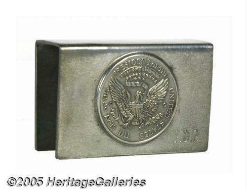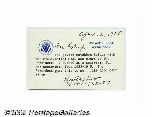 <B>FDR Pewter Matchbox Holder</B></I> Although not considered to be politically correct today, President Franklin D. Roosevelt will be remembered in many photos smoking cigarettes at various political meetings. Dorothy Dow, a secretary for the Roosevelts during their entire time at the White House, was lucky enough to receive a unique gift from FDR - a pewter matchbox holder with the Presidential Seal and FDR's monogram engraved on the front. Dow was the author of a book entitled <I>Eleanor Roosevelt, An Eager Spirit</B></I> and worked at the White House from 1933 until 1957. A White House card signed by Dow documents the President's own Val-Kill matchbox holder. Lot:254