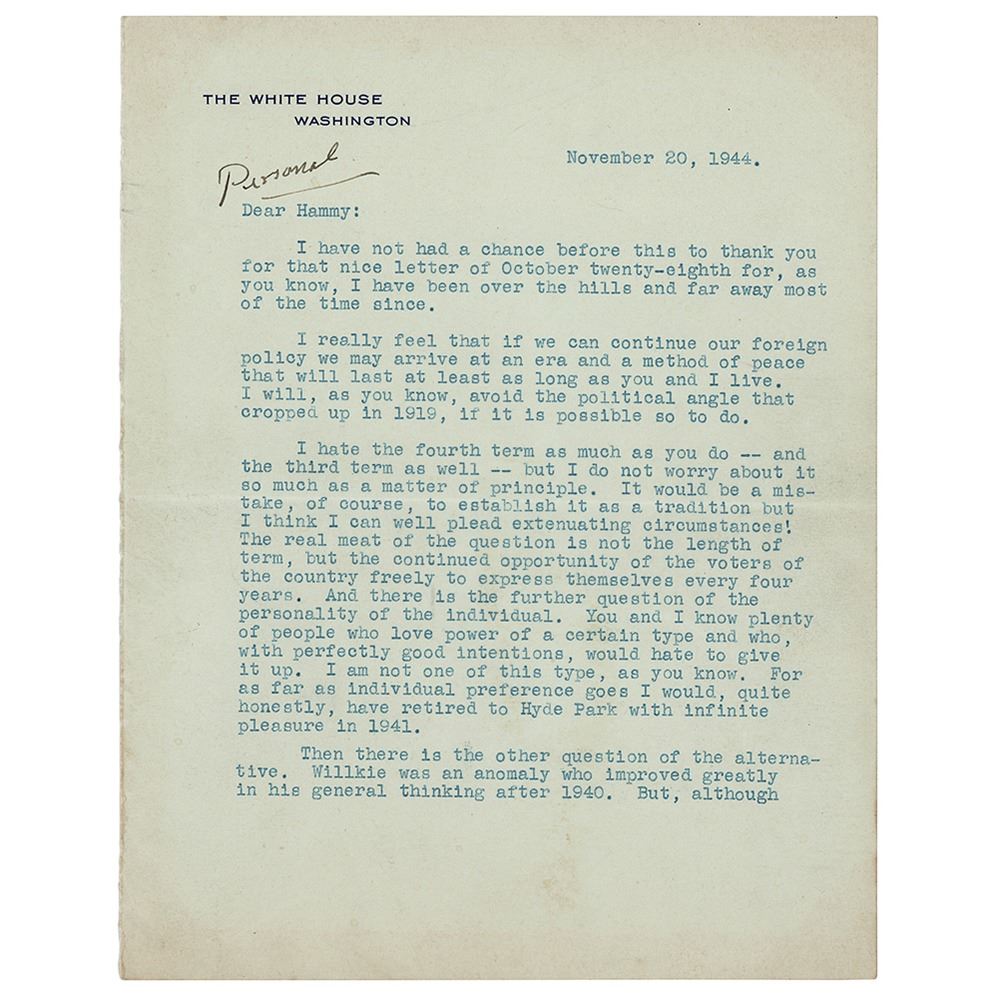 The presidentially signed letter, two pages, 7 x 8.75, White House letterhead, November 30, 1944, marked "Personal" at the top, is addressed to his close friend Hamilton Holt, the president of Rollins College in Winter Park, Florida. Written a few weeks after the 1944 presidential election, which gave FDR the slimmest margin of victory of his four presidential races, the letter provides a frank explanation of Roosevelt’s decision to seek an unprecedented fourth term as POTUS. He thanks Holt for a letter he was incapable of answering sooner, for, "as you know, I have been over the hills and far away for most of the time," and expresses, now that an Allied victory over Axis powers seems assured, that he looks forward to the challenges of peace-time: "I really feel that if we can continue our foreign policy we may arrive at an era and a method of peace that will last as long as you and I live. I will, as you know, avoid the political angle that cropped up in 1919, if it is possible so to do."