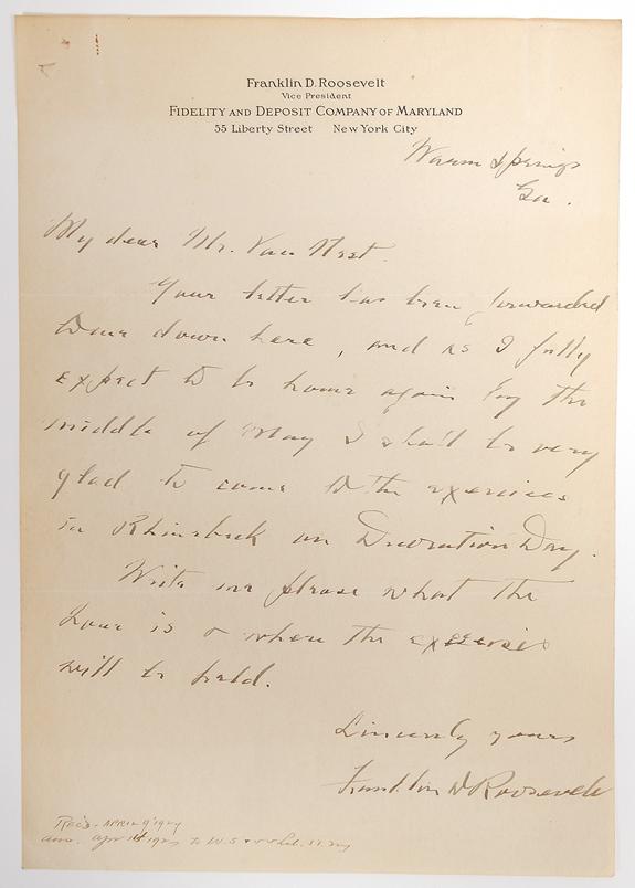FDR Reenters the Public Arena After Getting Polio. Autograph letter signed, on Fidelity and Deposit Company of Maryland letterhead (FDR was Vice President in the New York City office), but datelined Warm Springs, Ga., 1 page, 10½ x 7¼", n.d (pencil notation at lower left indicates that the letter was received on April 9, 1924). Written to Mr. Van Ness, indicating FDR's willingness to reengage in civic events once again, after his early battles with polio (or what was thought to be polio at the time): "Your letter has been forwarded to me down here, and as I fully expect to be home again by the middle of May, I shall be very glad to come to the exercises of the Rhinebeck on Decoration Day. Write me please what the hour is & where the exercise will be held…." Barely a month and a half later, on June 26, 1924, FDR stood at the podium at Madison Square Garden in New York City and made his inspiring "Happy Warrior" speech to nominate Alfred E. Smith as the presidential candidate for the Democratic party. Smith did not receive the nomination until 1928, but FDR's speech wowed the crowd and signaled his return to politics. He was elected governor of New York in 1928, then President in 1932. This letter is written from the place he went to fight his paralysis and where he would die 21 years later, and is an indication of his determination to once again enter the public arena. Light toning and minor blemishes in upper left corner, else fine.